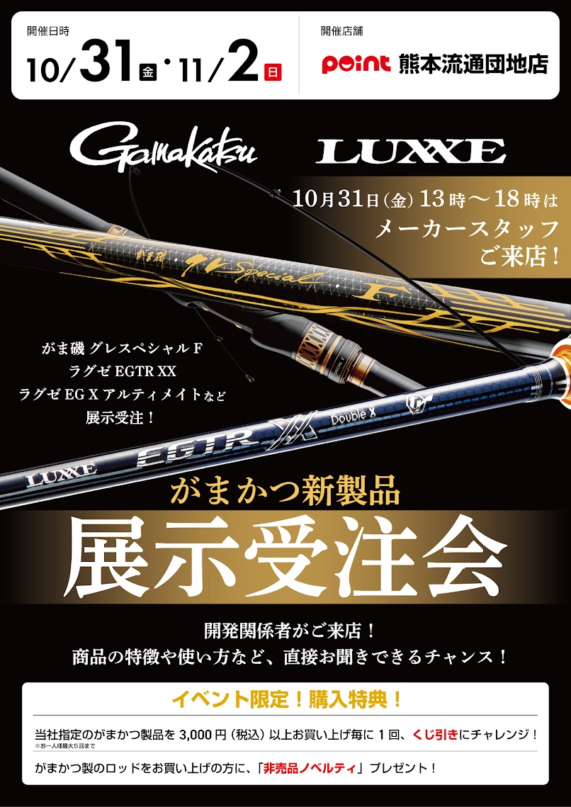 皆さんこんにちは ポイント熊本流通団地店です 10月31日(金)・11月2日(日) がまかつ新製品展示受注会開催致します! 10月31日(金)13:00~18:00は...
