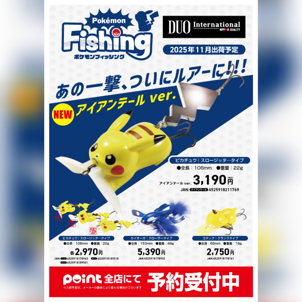 みなさまこんにちは ポイント松山平田店です 再びやって参りました、大人気DUOのポケモンルアー、本日より予約受付開始いたしております 今回はピカチュウ/スロージッタータイプに新しく「...