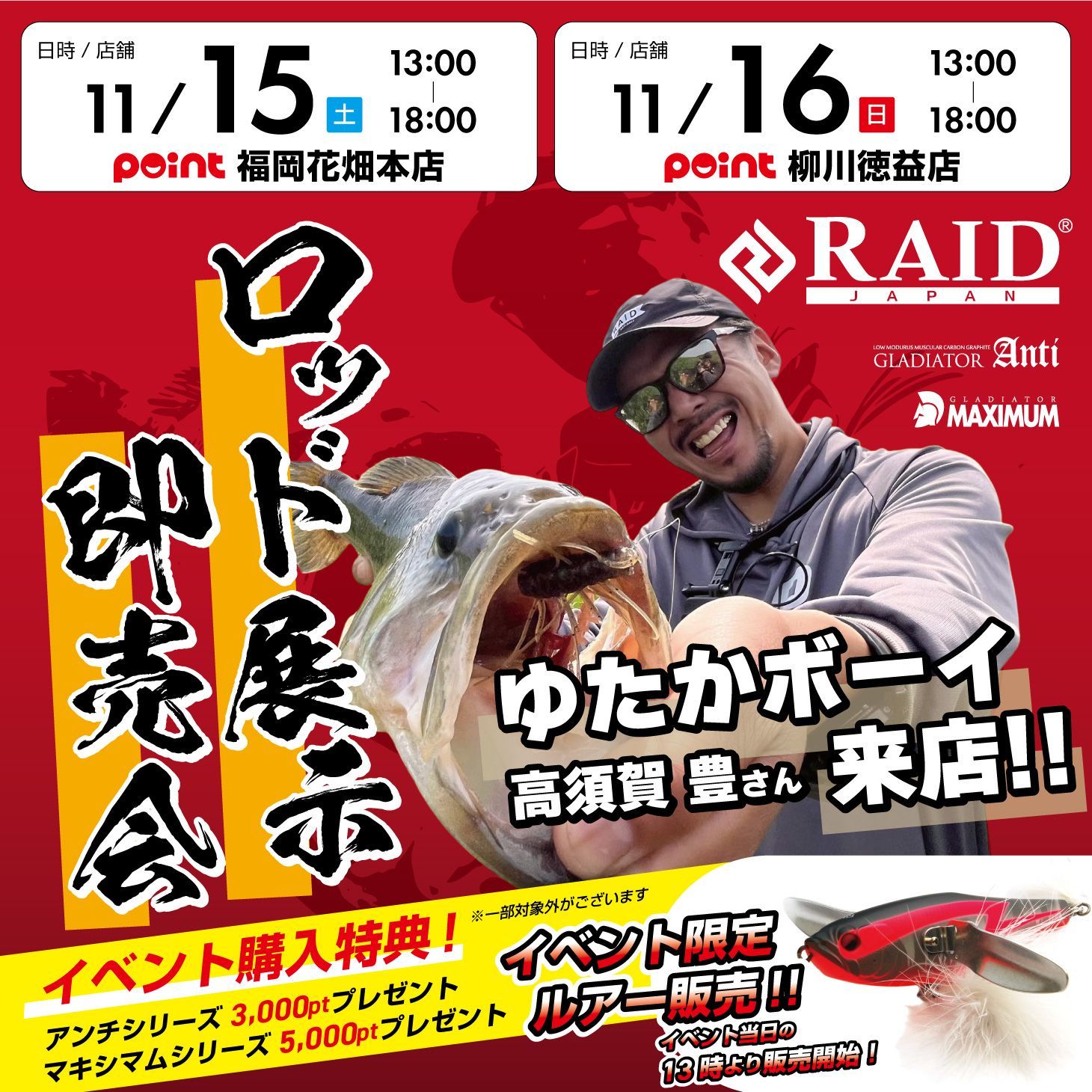 こんにちは香椎店です 本日はイベントのご案内です 11月15日(土)13時~18時まで 福岡花畑本店にて RAID ロッド展示即売会を 開催いたします 当日は、『ゆたかボー …...