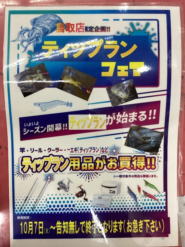 こんにちは!!鳥取店です!! 鳥取店限定企画 【ティップランフェア】 開催中!!! 大流行のティップラン 鳥取店だけの特別企画 ティップラン用品が超お買い得価格にてご奉仕...