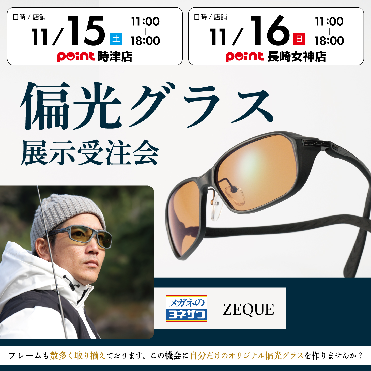 皆さんこんにちは! ポイント時津店です! イベント情報のお知らせです 【11/15(土) 11:00~18:00】 ご好評の『偏光グラス展示受注会』を 開催致します...