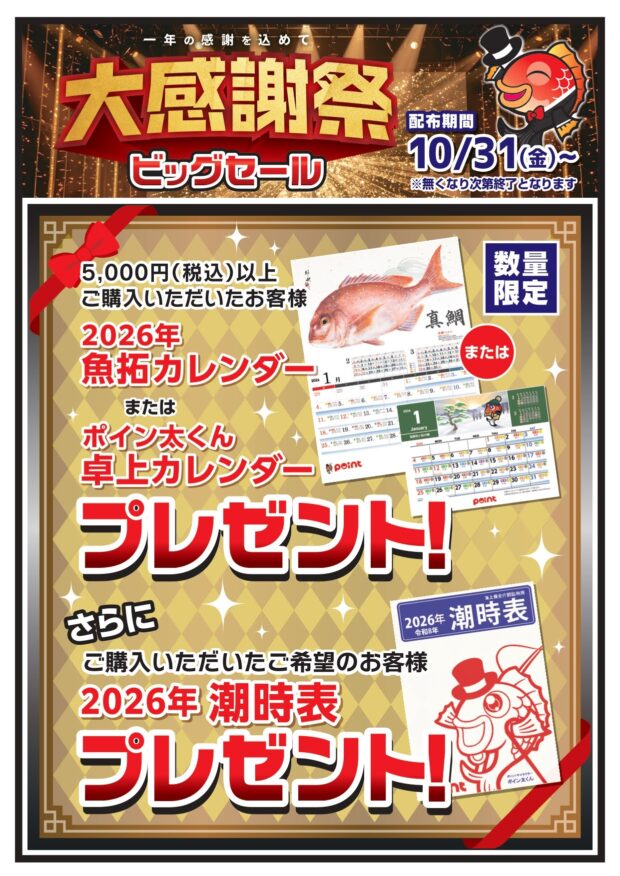 一年の感謝の気持ちを込めて、 「大感謝祭ビッグセール」を開催いたします! 期間:10/31(金)11/16(日) 店舗:釣具のポイント全店・...