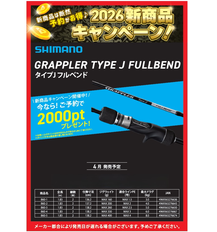 熊本富合店 村田2026/01/29皆様こんにちは!釣具のポイント富合店です!! 只今新商品キャンペーンを実施中です! その対象商品の一つが今回ご紹介させて頂く【26グラップラータイプj フルベンド】です!...