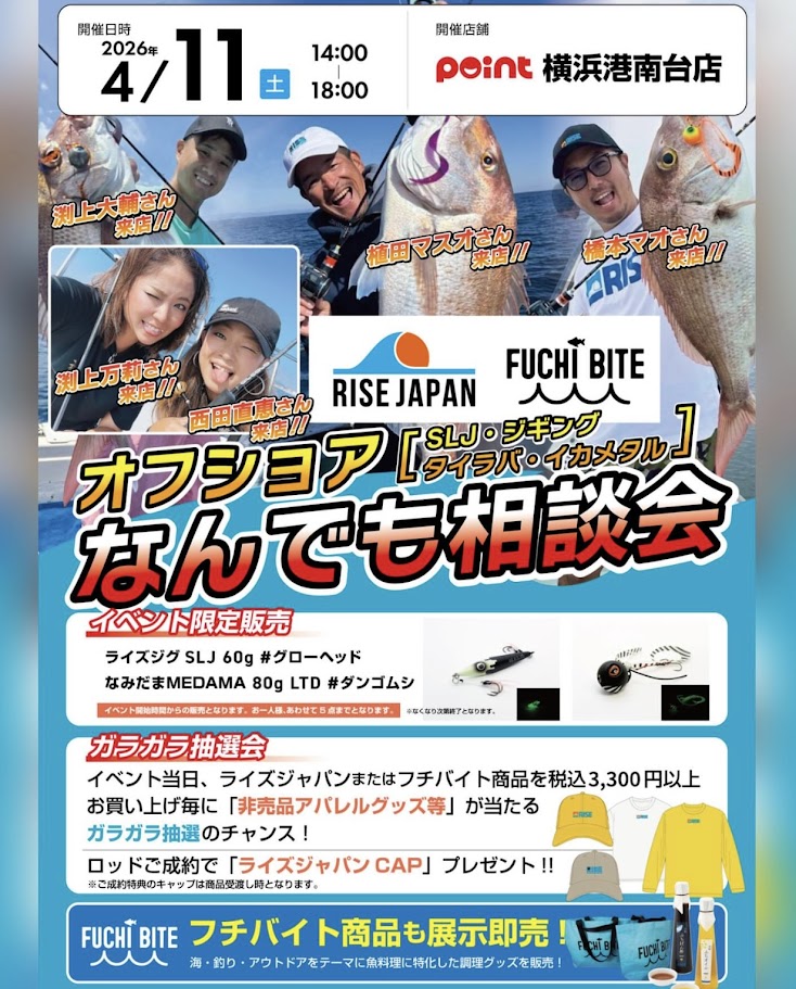 横浜港南台店 渡部2026/03/31皆様こんにちは 釣具のポイント横浜港南台店です! 【イベントのご案内】 4/11(土) 14:00〜18:00 当店におきまして 【RISE JAPAN】様 【FUCHI BITE】様をお招き...
