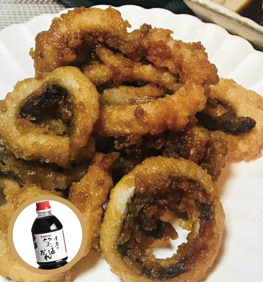 ①料理酒+イカの笑油だれでイカの下味をつけ、揚げる。
