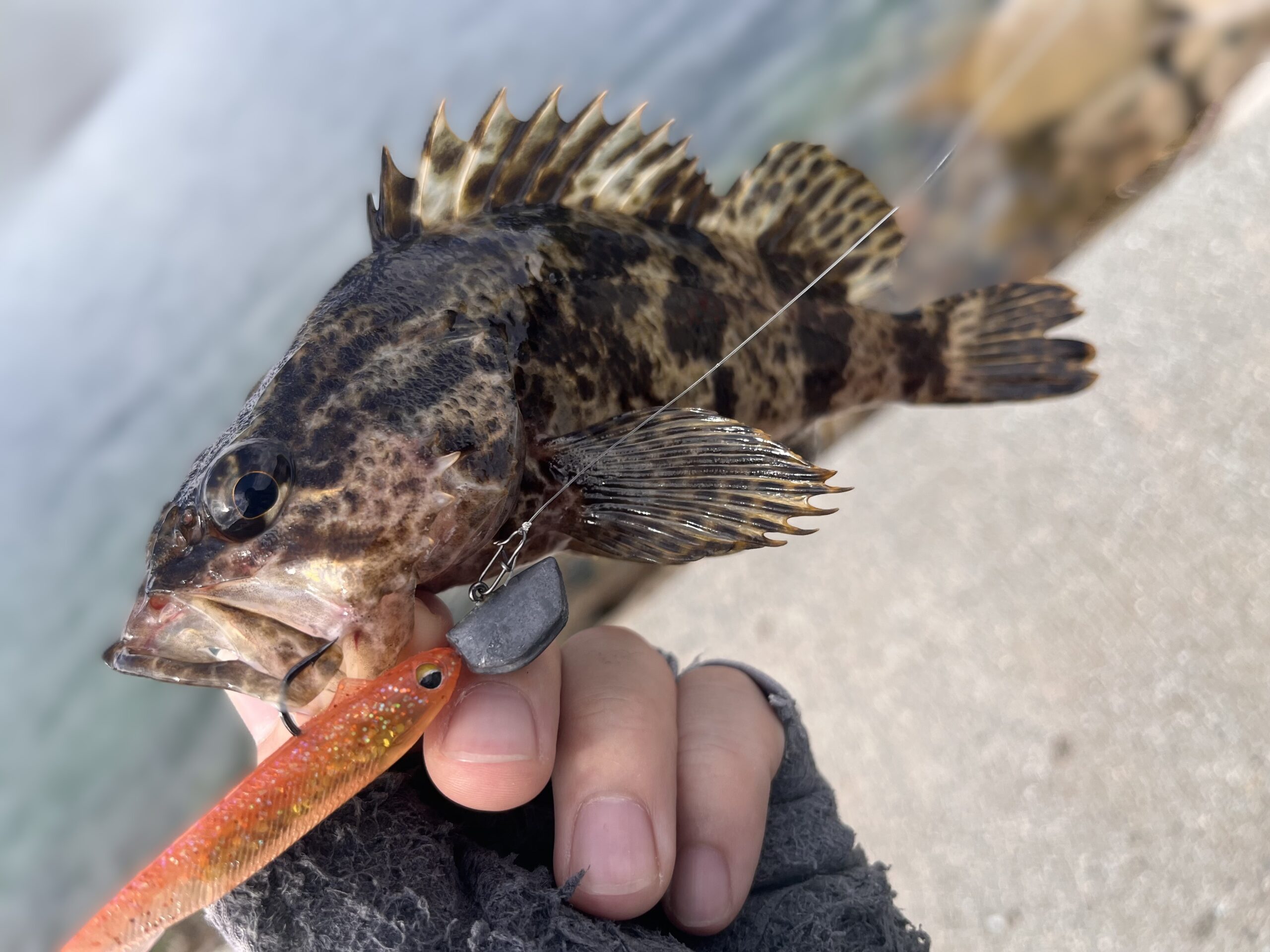潮が走り出すまでは足元の石積みで根魚遊び