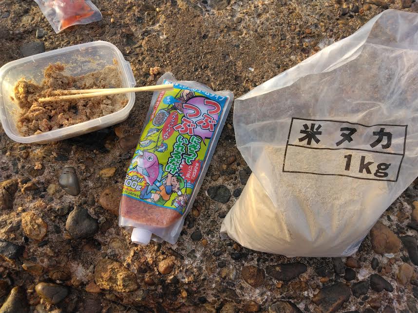 今回は米ぬかとチューブのアミエビを3:1くらいの配合で使用します。大体で大丈夫です(笑)全体にアミエビが混ざる様にしっかりと混ぜて下さい!!