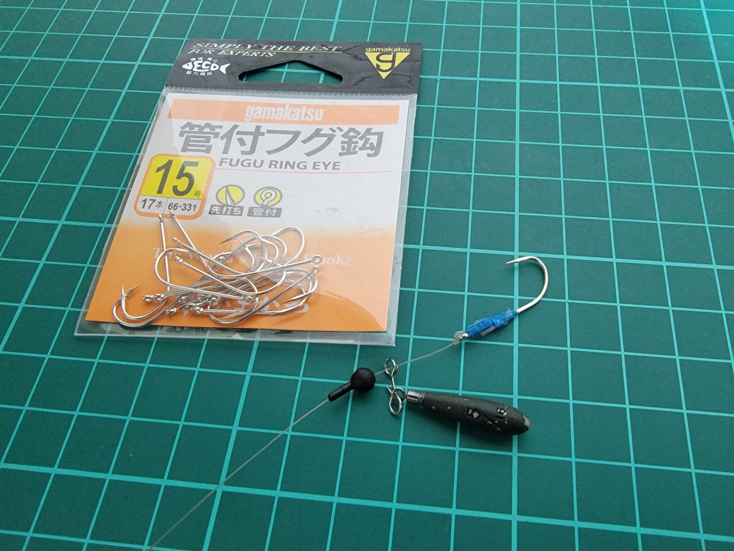 前回は管付うなぎあなごの12号と13号を使っていましたが、今回は別の鈎も使えないか?と思って管付フグ鈎 15号を選択。