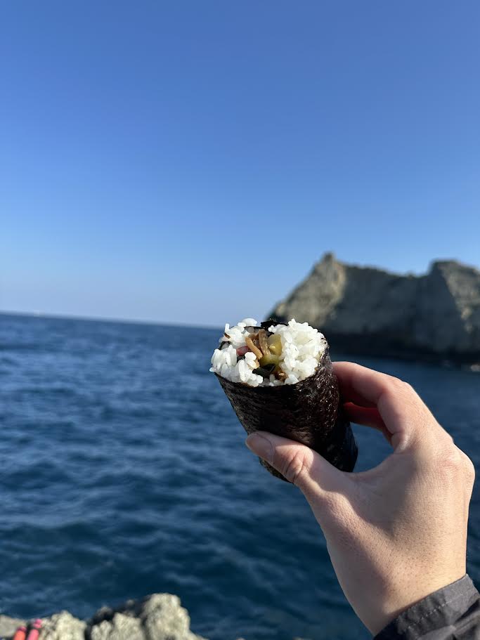 恵方巻を持っていき、磯の上でパクリ