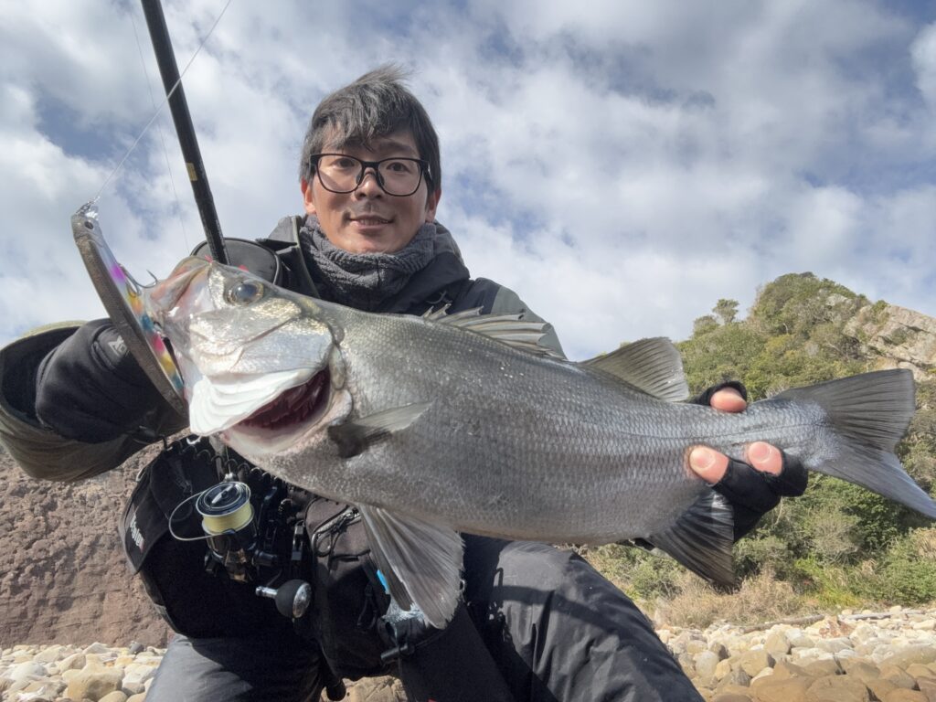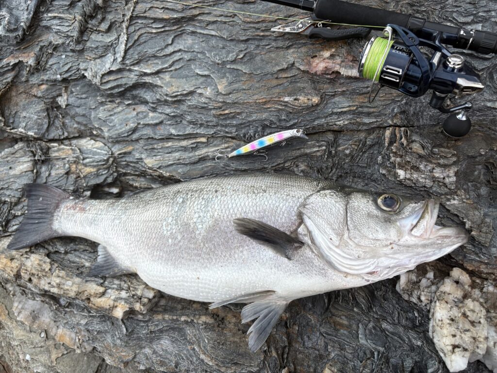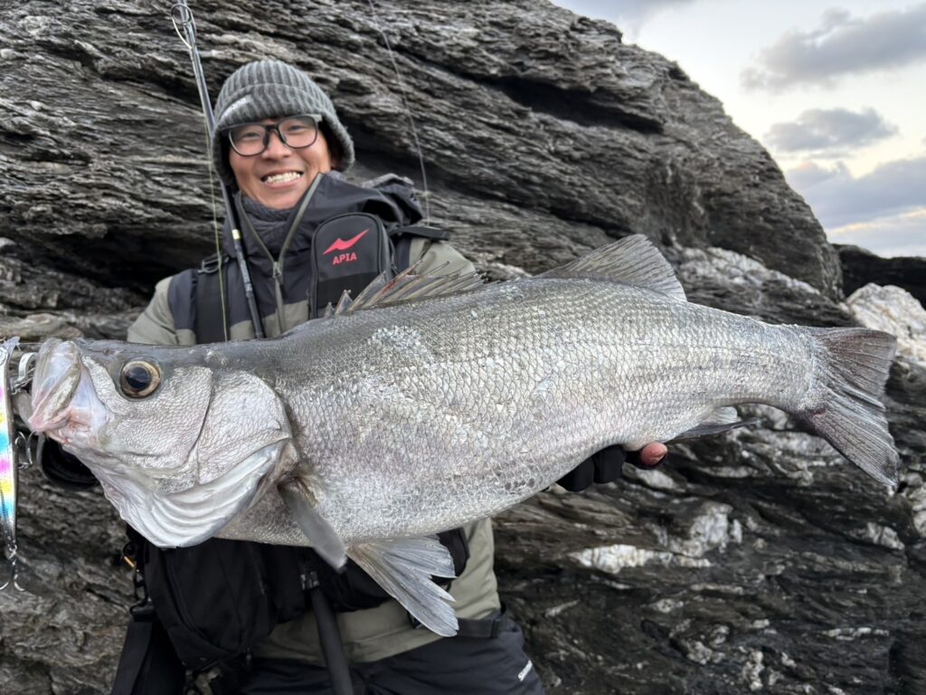 念願の初磯ヒラスズキ(58cm)をキャッチ✨