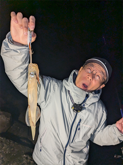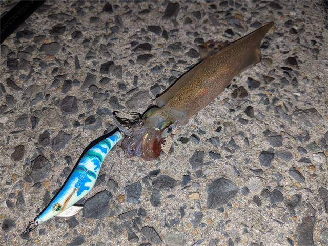 たぶん良いサイズがやっと釣れて、ダイワエギのカラー名「エビンパスゥゥ~...」を唱えている所かと。ぬるい目で読み過ごし下さい。