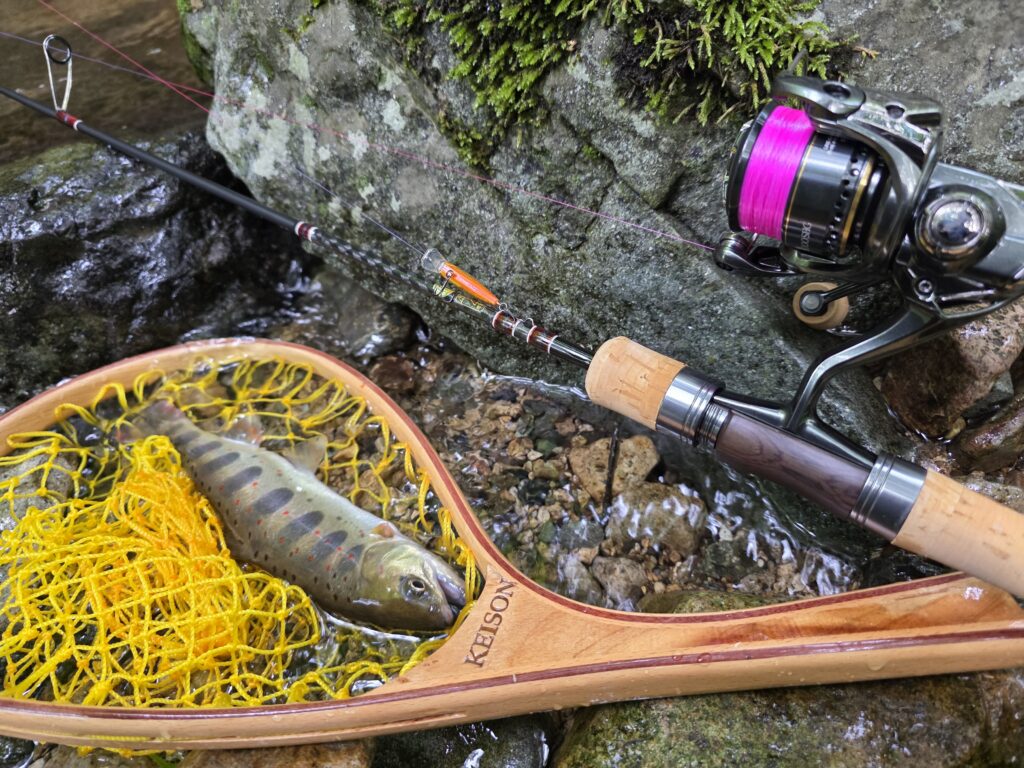 普段はルアーをしつつ淵に付いたらエサに替えて腰を据えて釣る、という方法は長さが必要ですが木が上にあったり横にサビけない場合が多いので長すぎない方が取り回ししやすいのでオススメなんです!