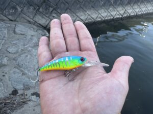 沖に投げ、リップラップに当てながら巻いてくると