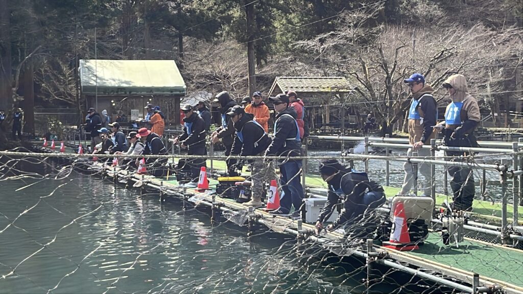 今回の大会は前日に8000匹ものニジマスを放流しています!