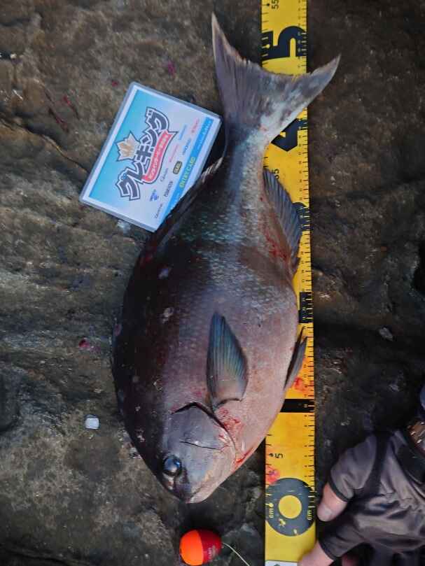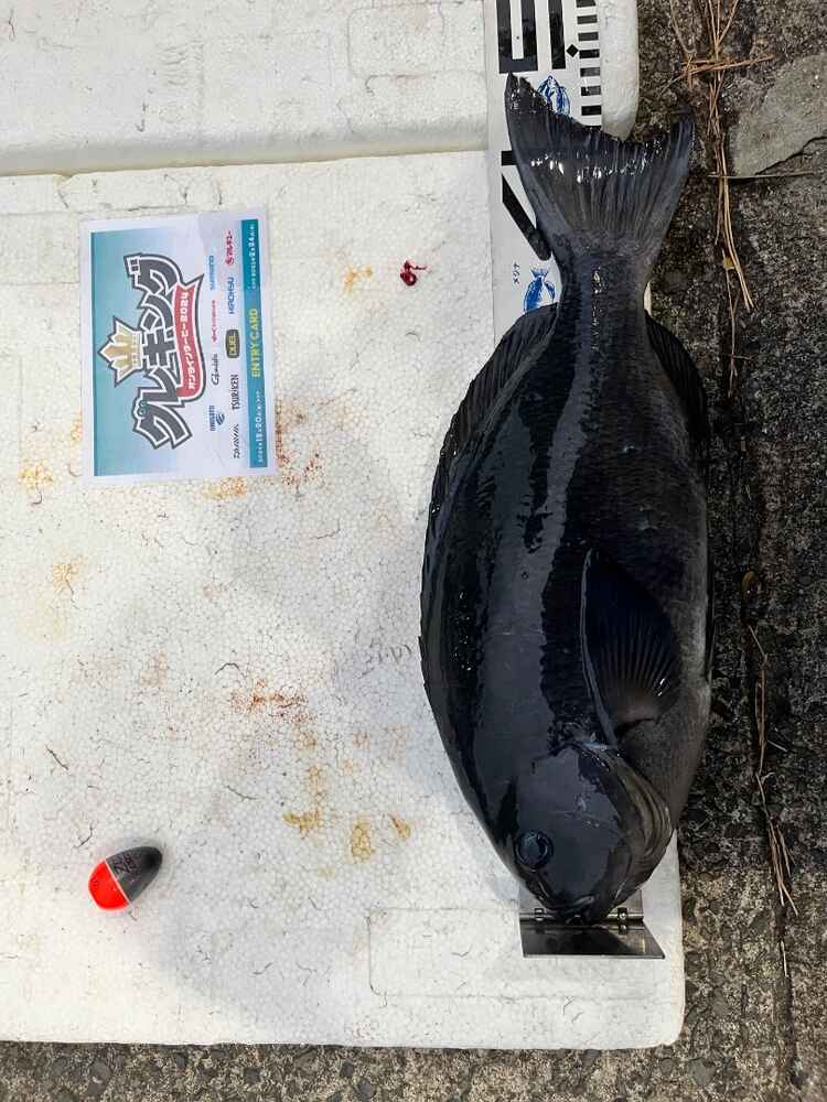 04. 協賛メーカーのウキを使って釣ったメジナとウキ、エントリーカードを添えてメジャーの上で撮影。