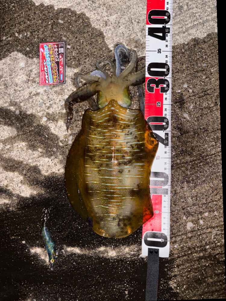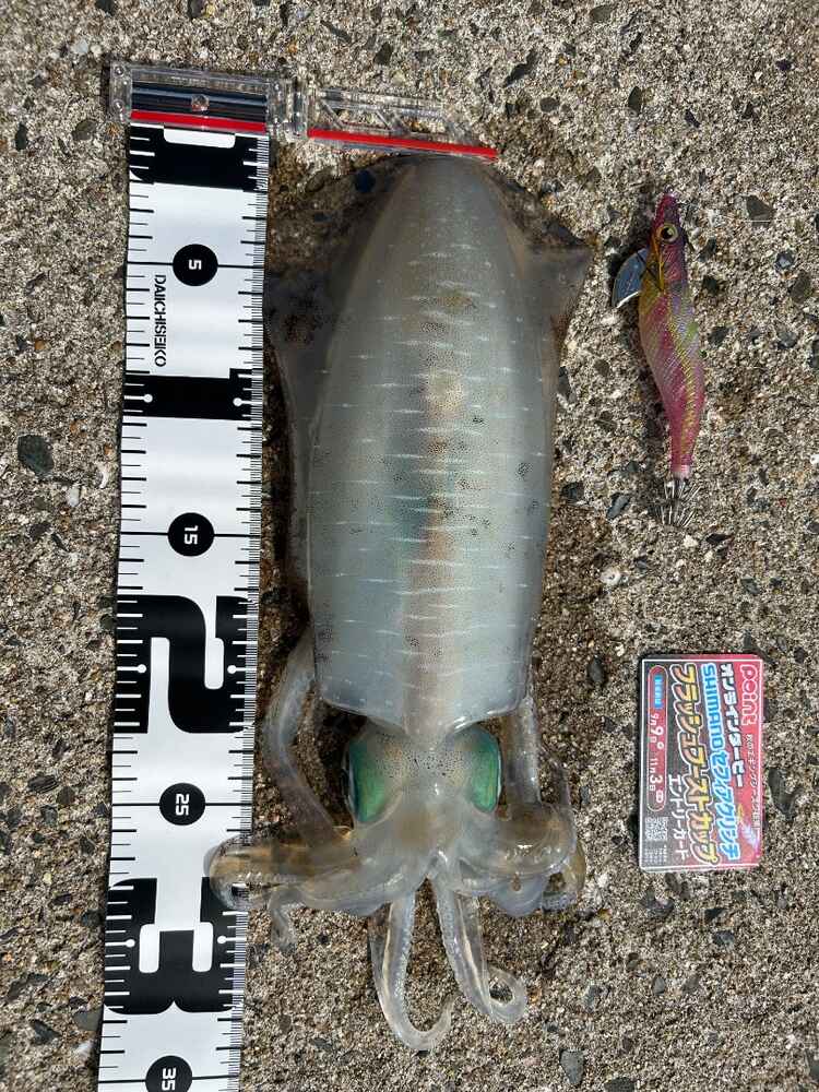 04. 釣ったアオリイカ・使用したエギ・メジャー・エントリーカードを一緒に撮影。