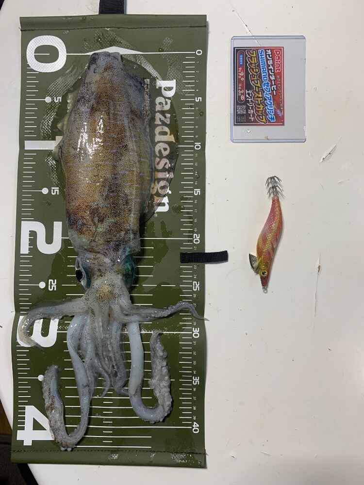 04. 釣ったアオリイカ・使用したエギ・メジャー・エントリーカードを一緒に撮影。