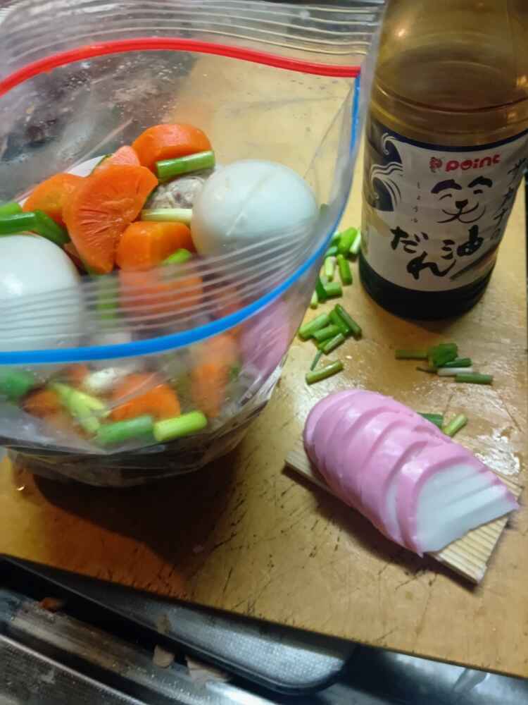 (1)料理(完成品)、(2)笑油だれ