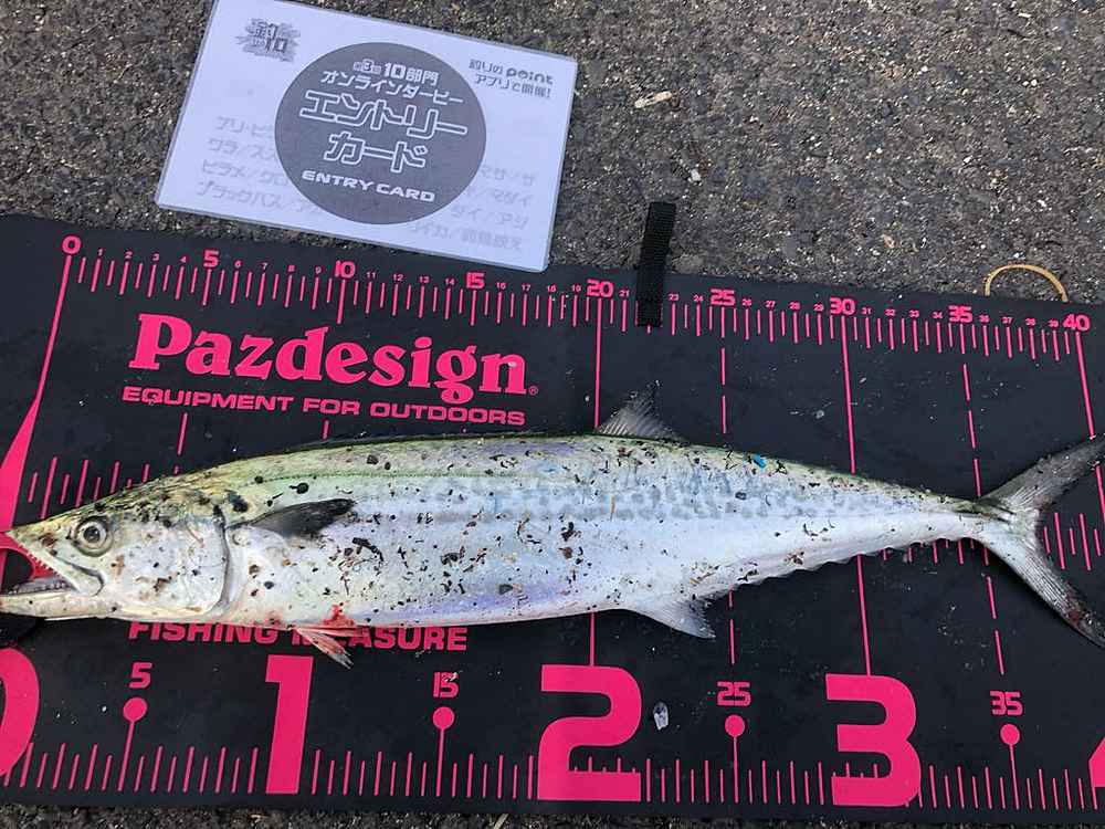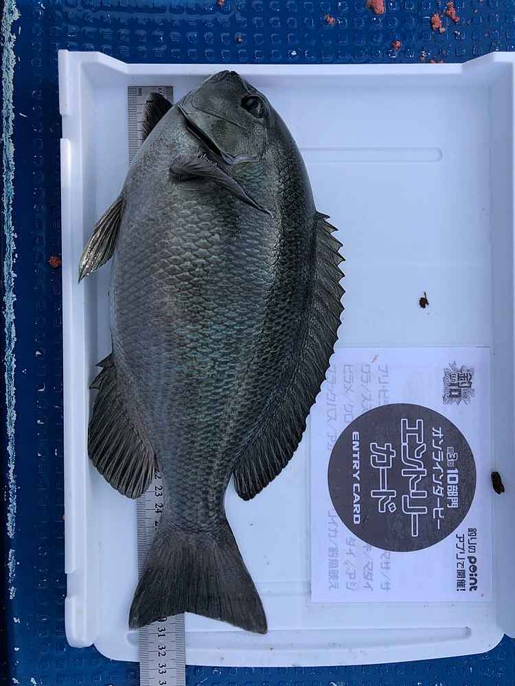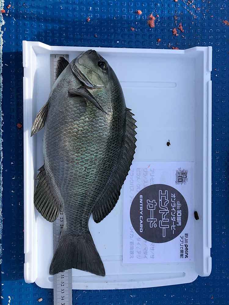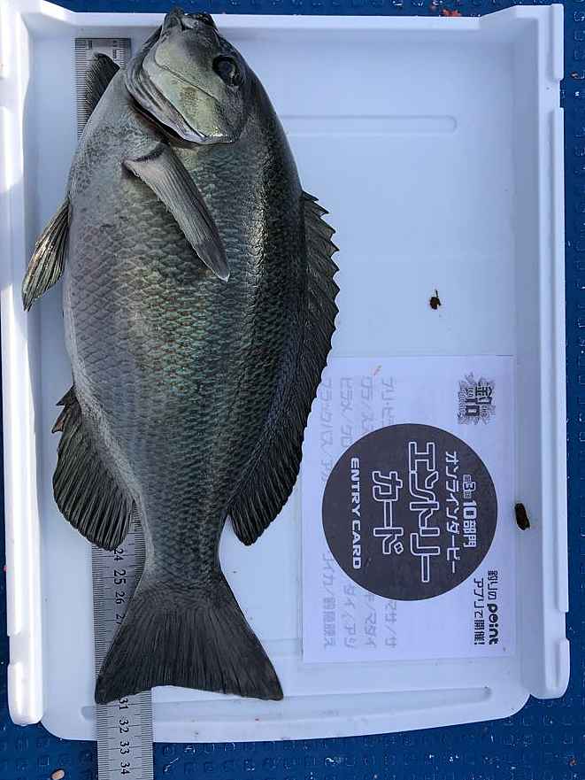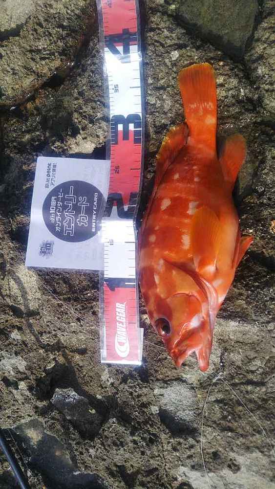 ②期間中での釣果を証明するため、釣魚単体とエントリーカードを合わせて撮影した写真