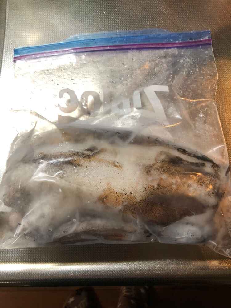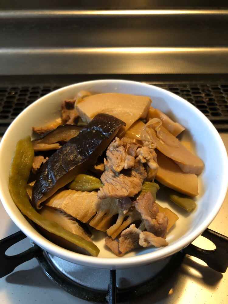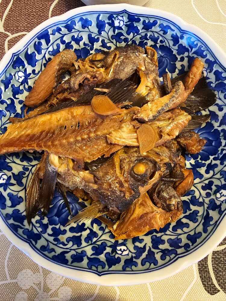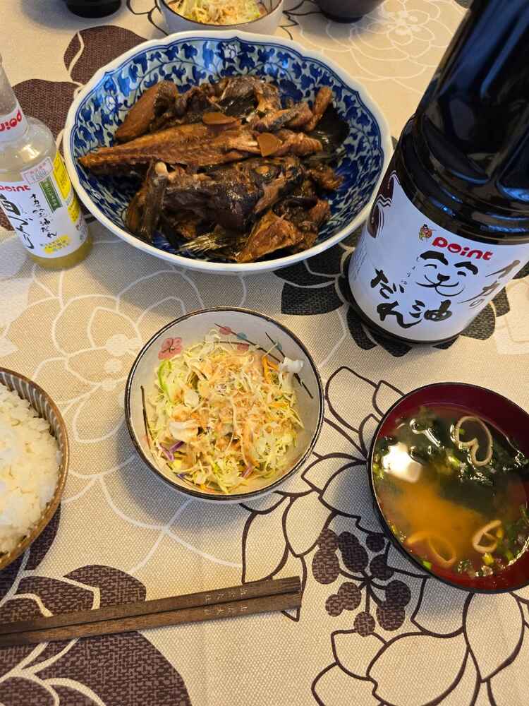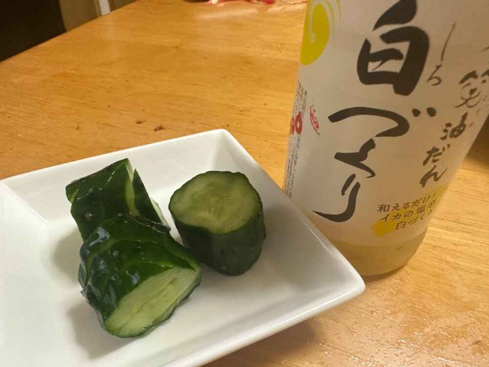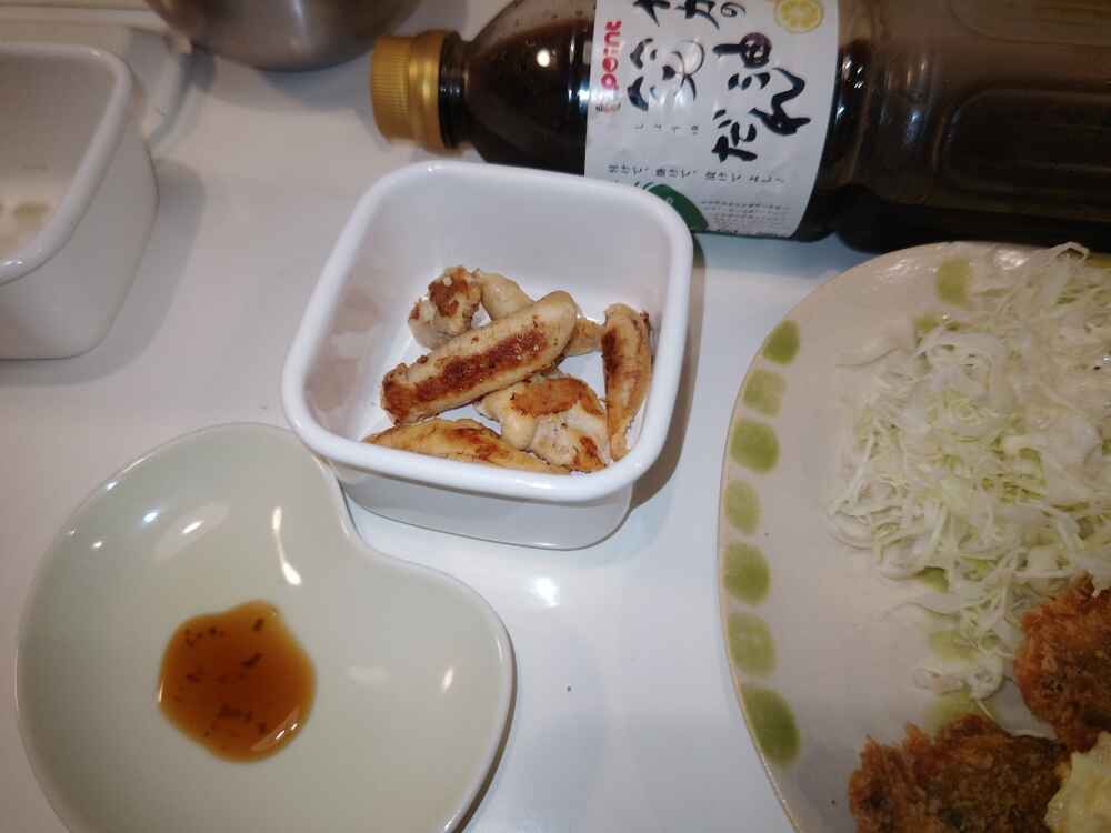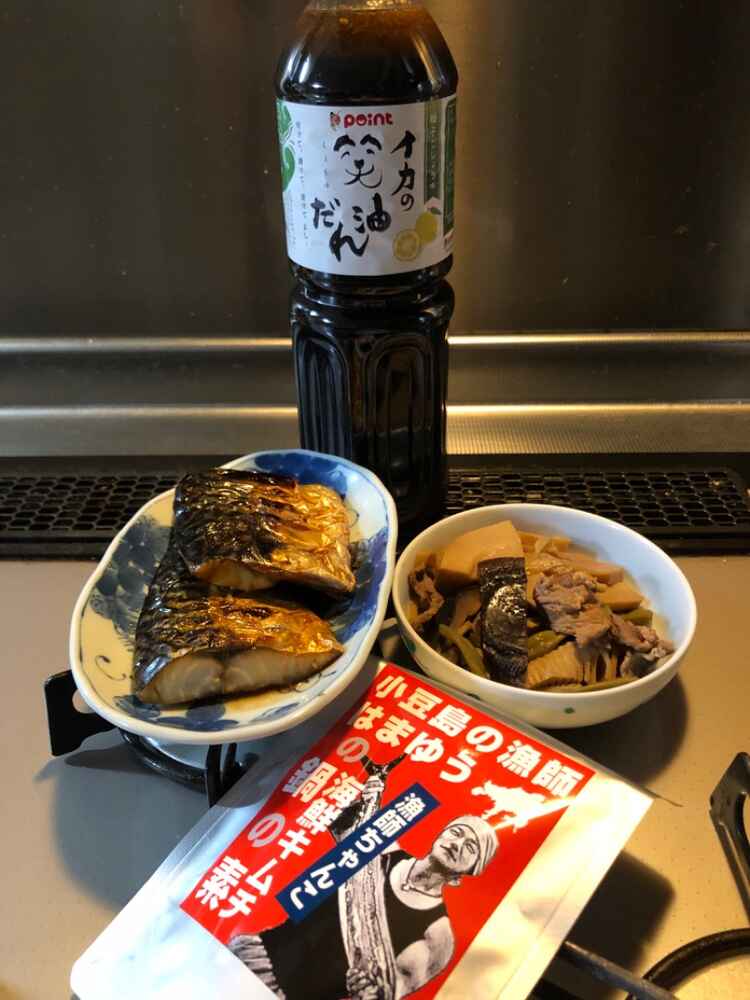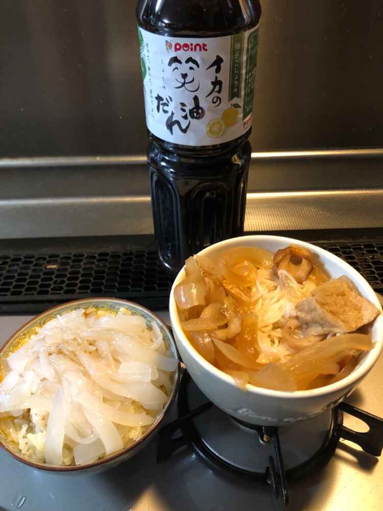 (1)料理(完成品)、(2)イカの笑油だれ