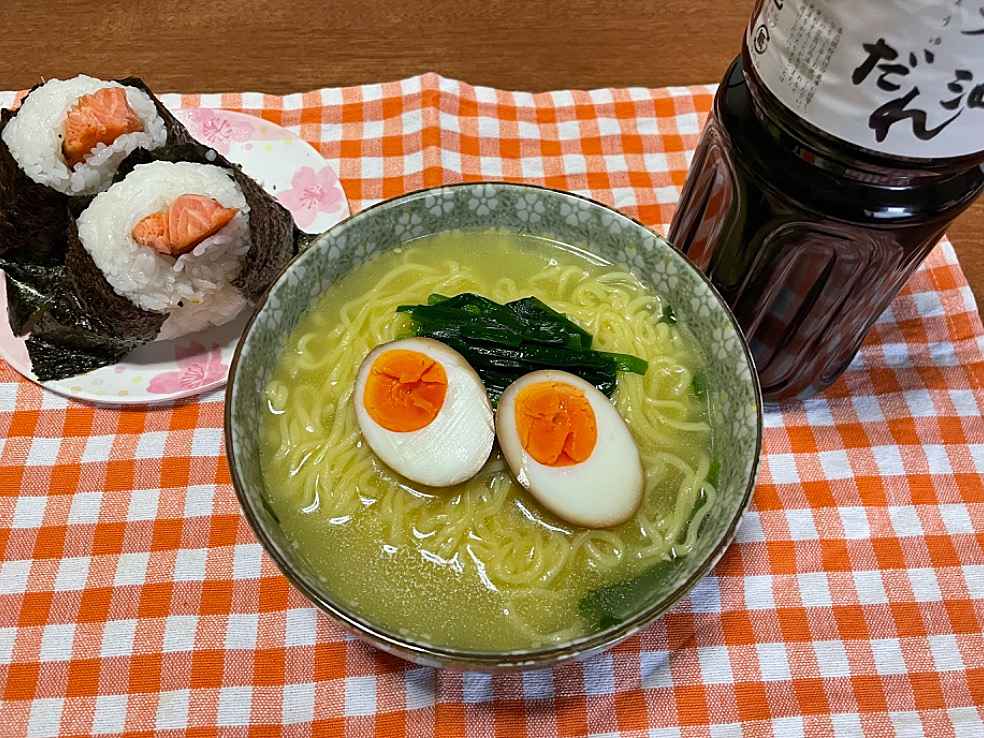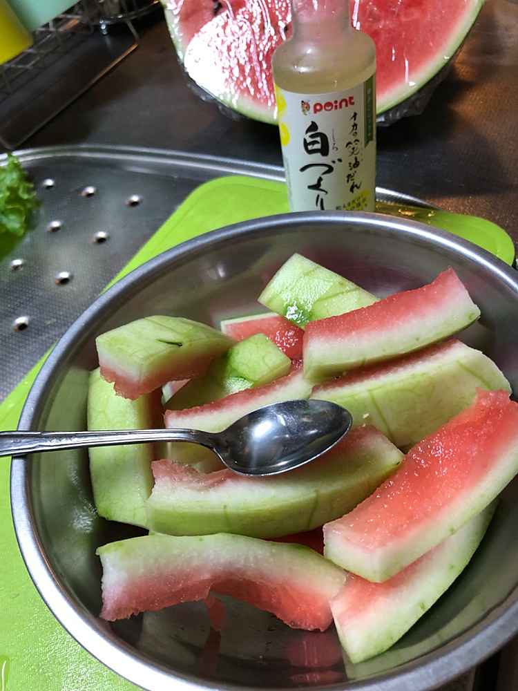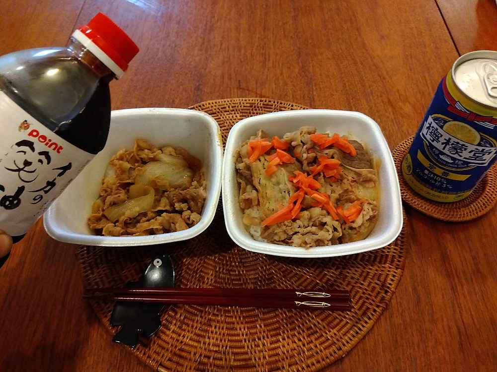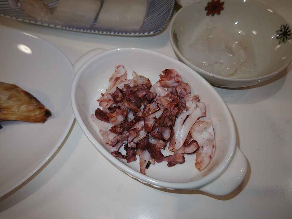 (1)料理(完成品)、(2)イカの笑油だれ