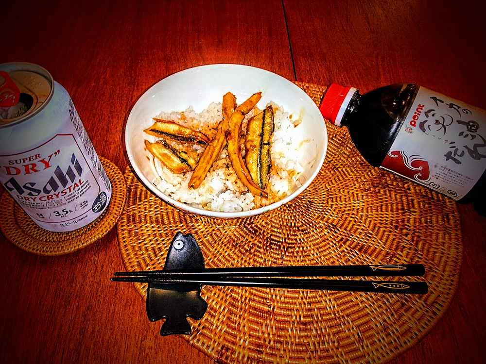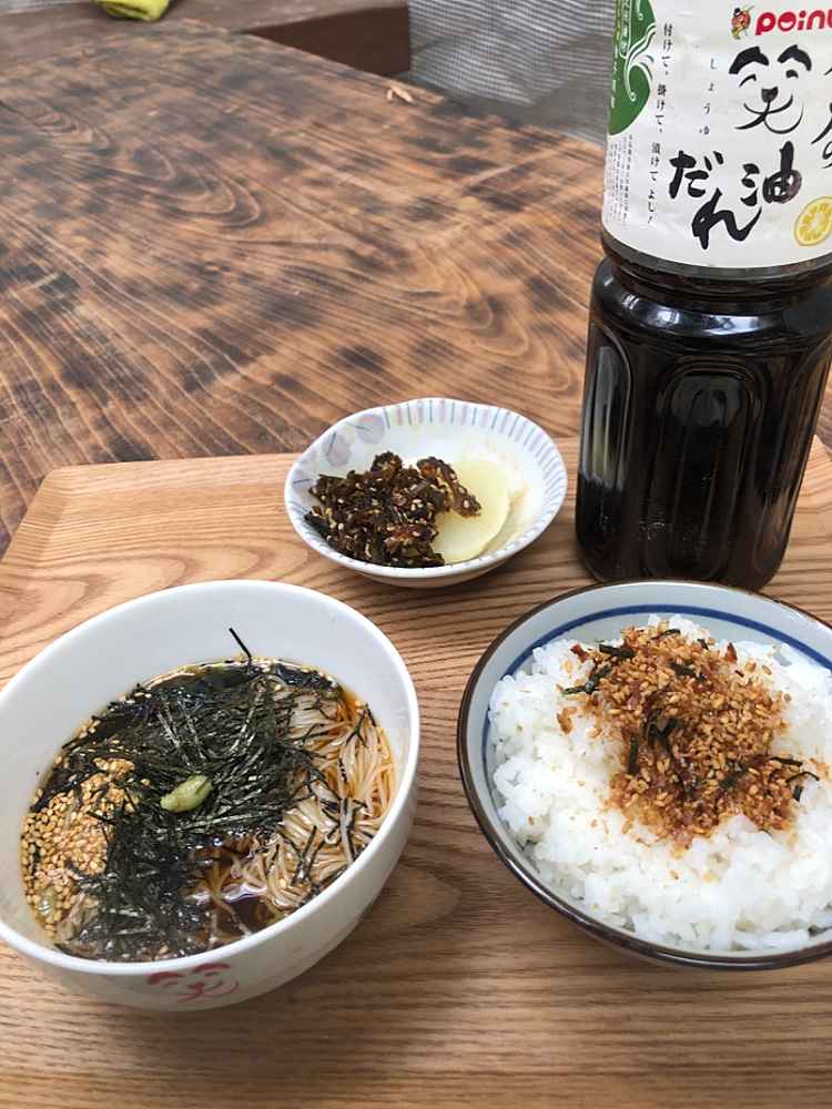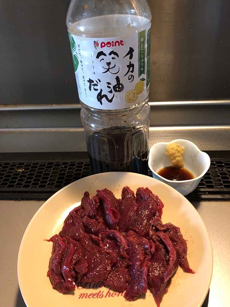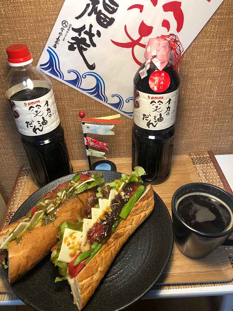 (1)料理(完成品)、(2)イカの笑油だれ