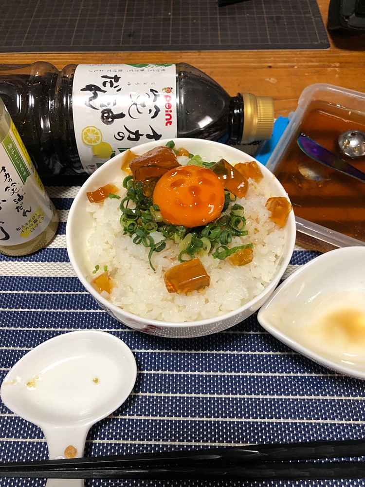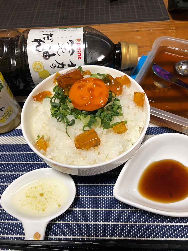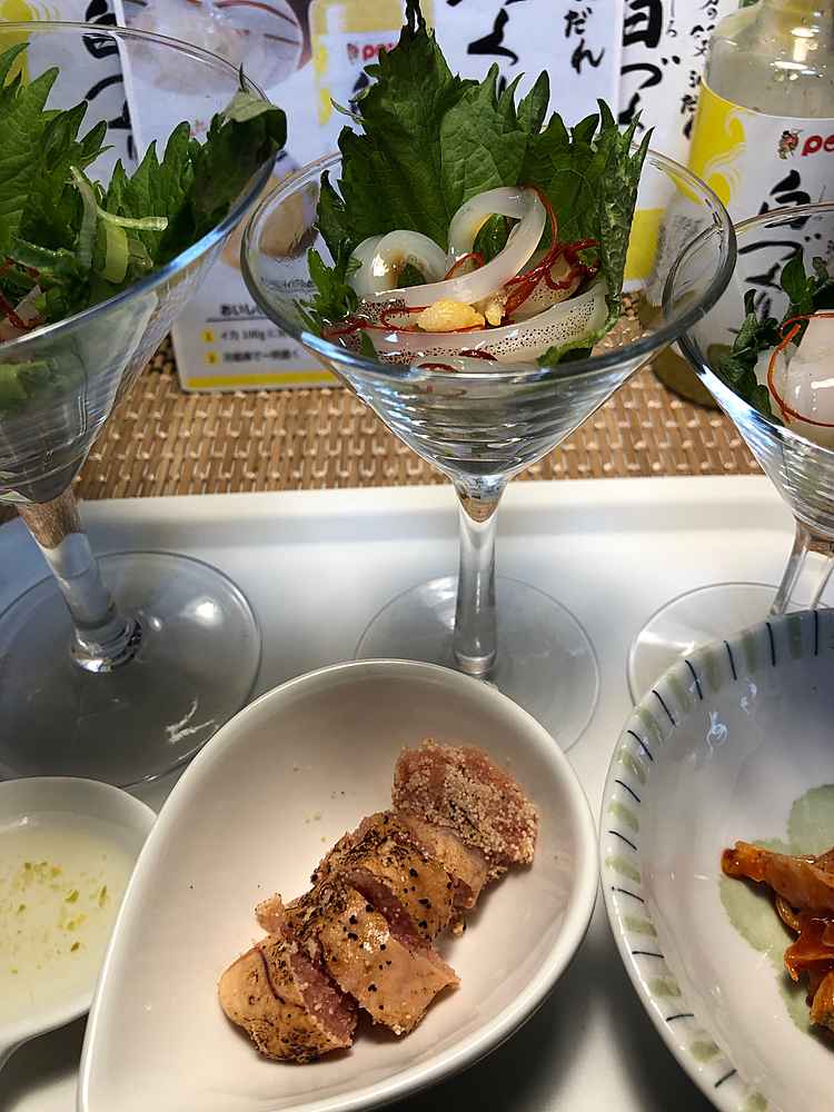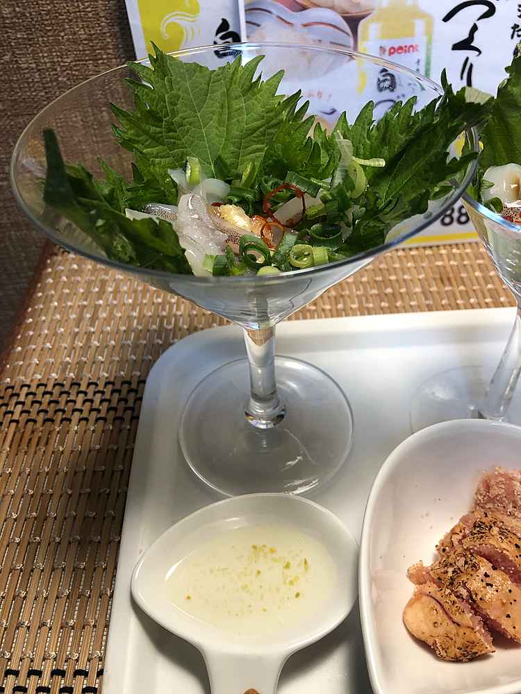 (1)料理(完成品)、(2)イカの笑油だれ
