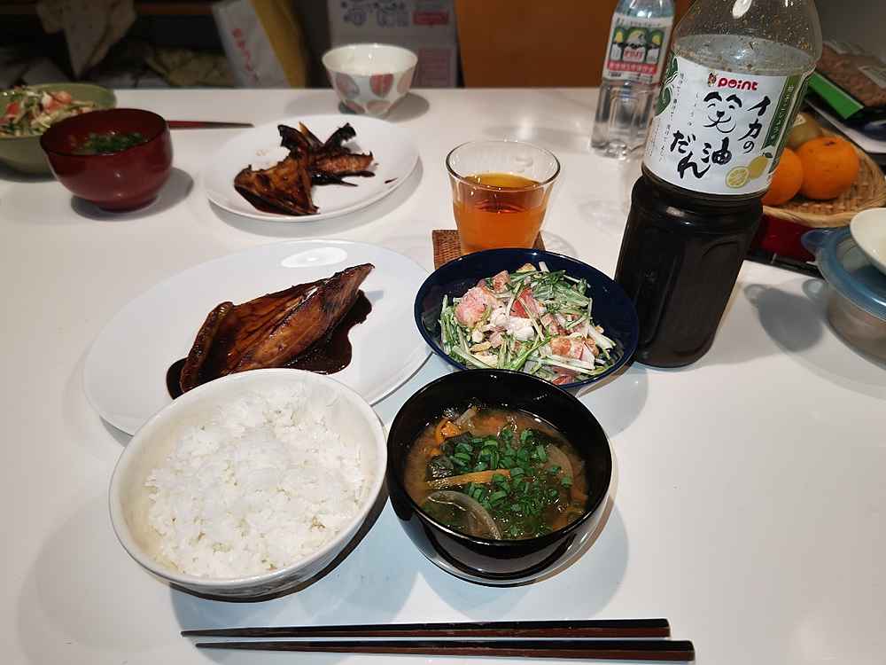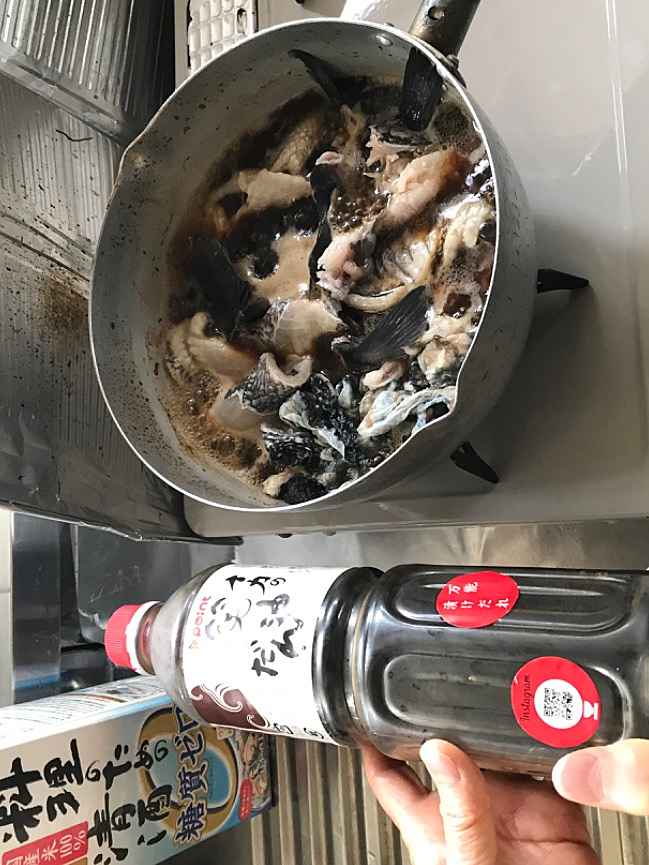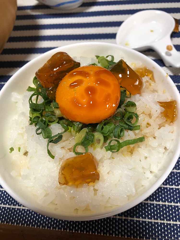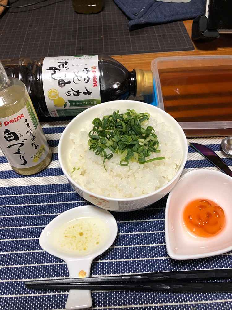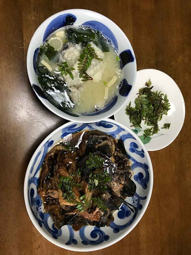 (1)料理(完成品)、(2)イカの笑油だれ