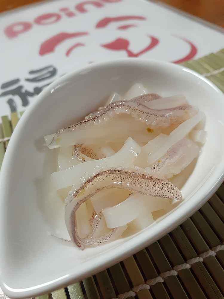 (1)料理(完成品)、(2)イカの笑油だれ