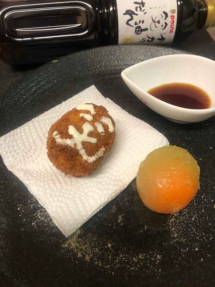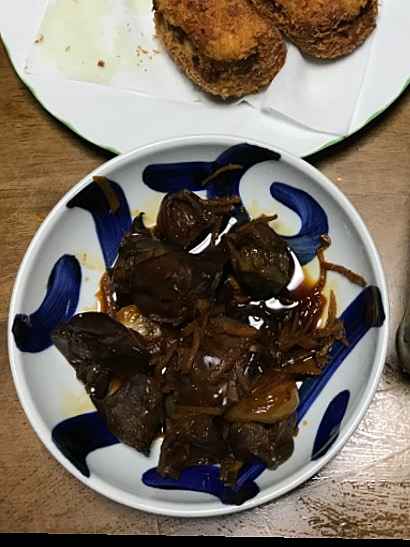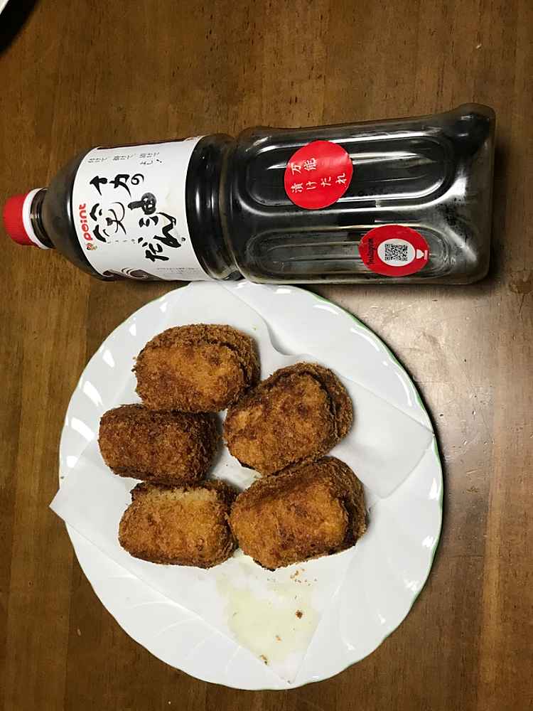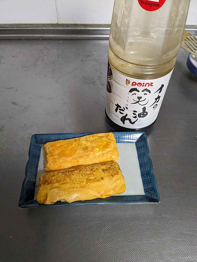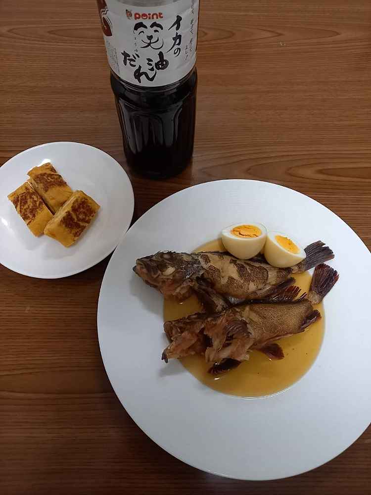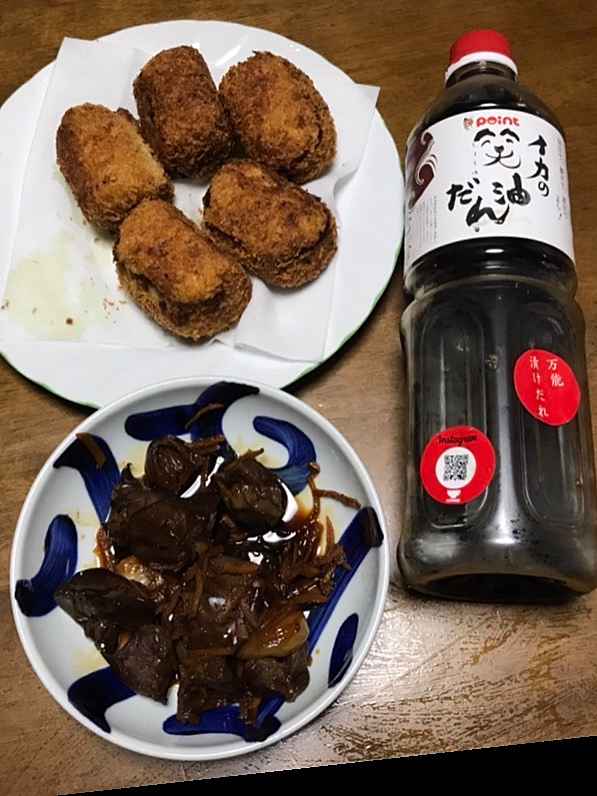 (1)料理(完成品)、(2)イカの笑油だれ