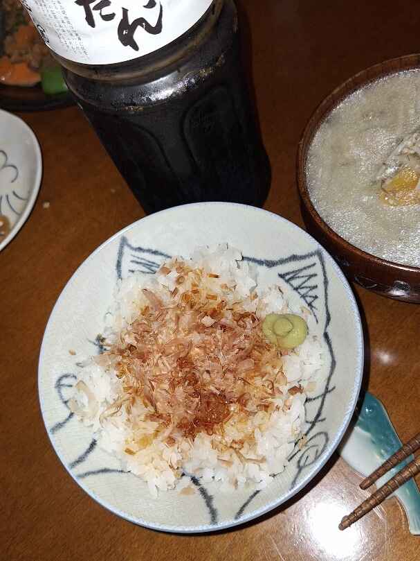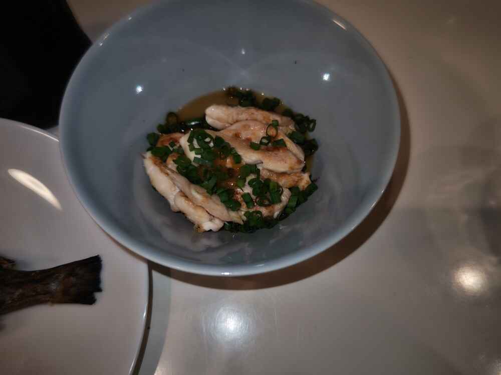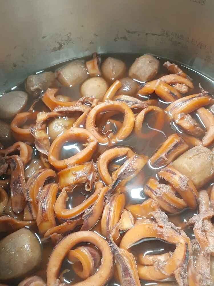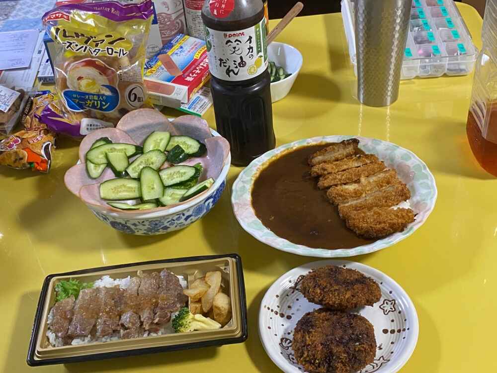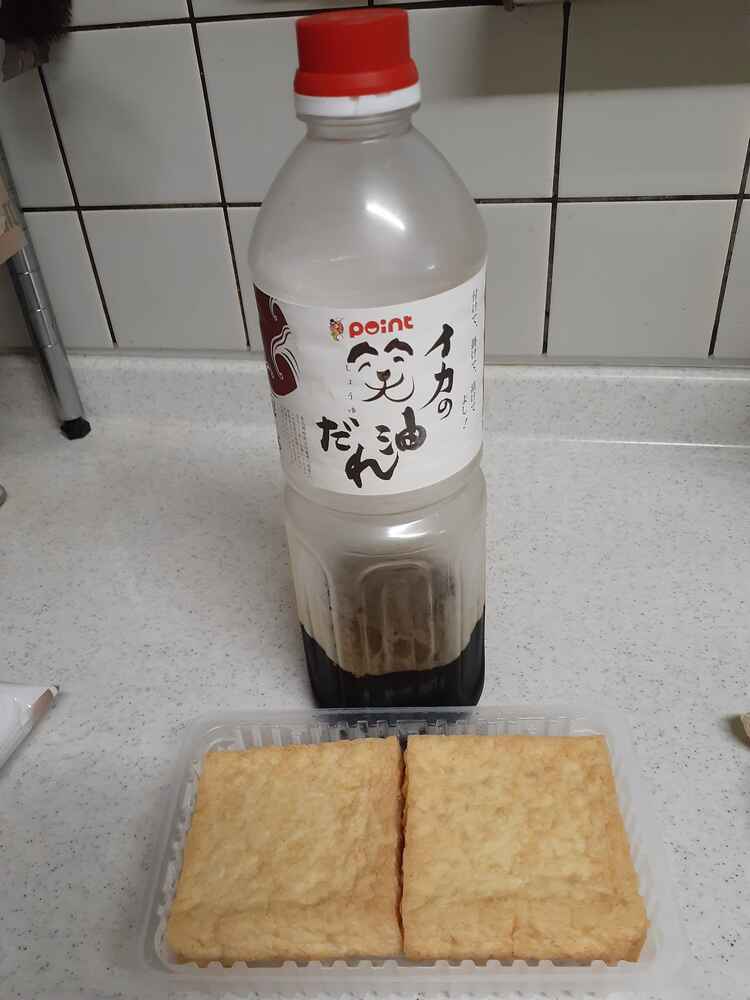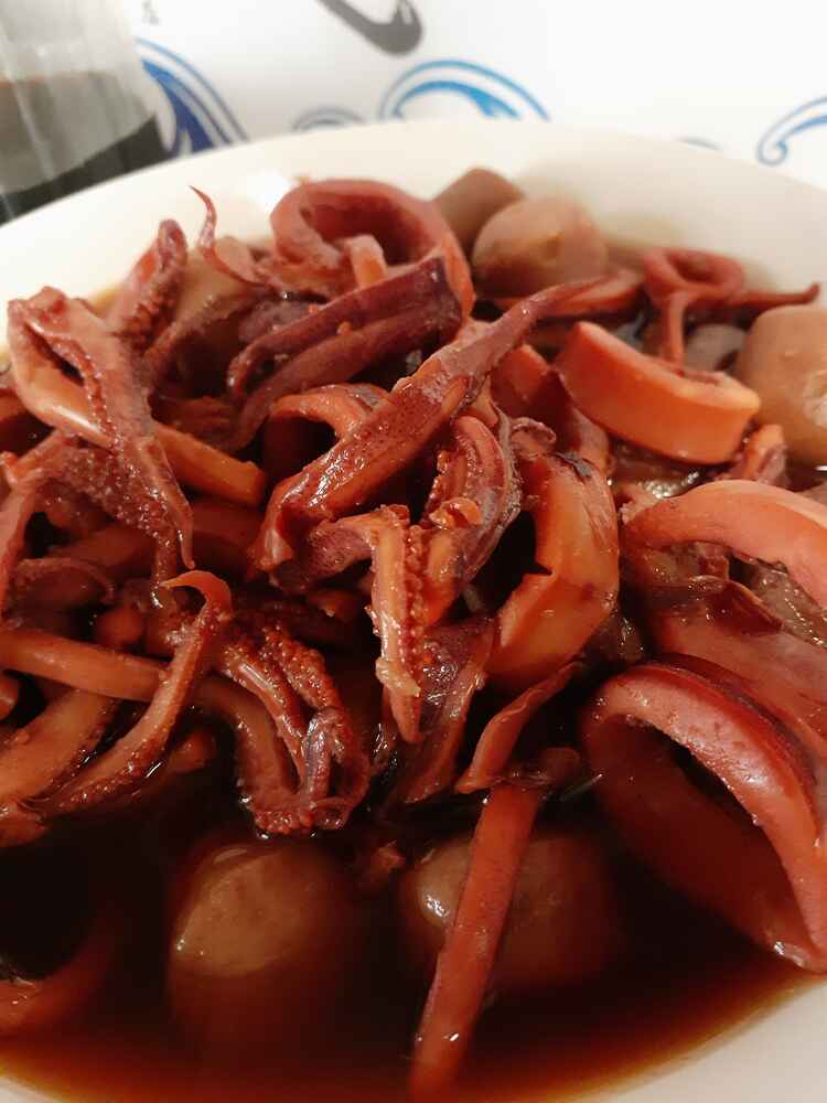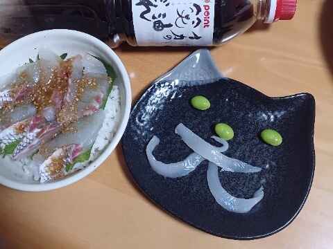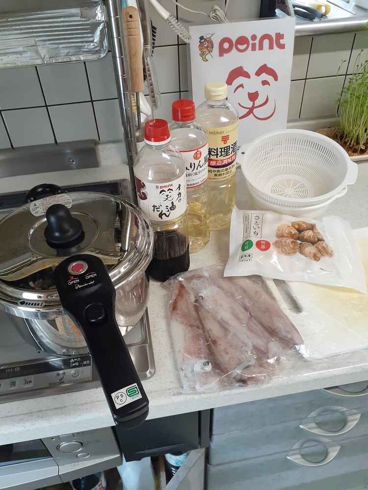 (1)料理(完成品)、(2)イカの笑油だれ