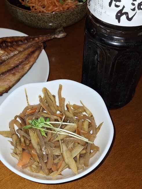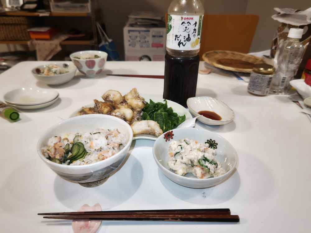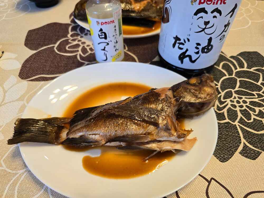 (1)料理(完成品)、(2)イカの笑油だれ