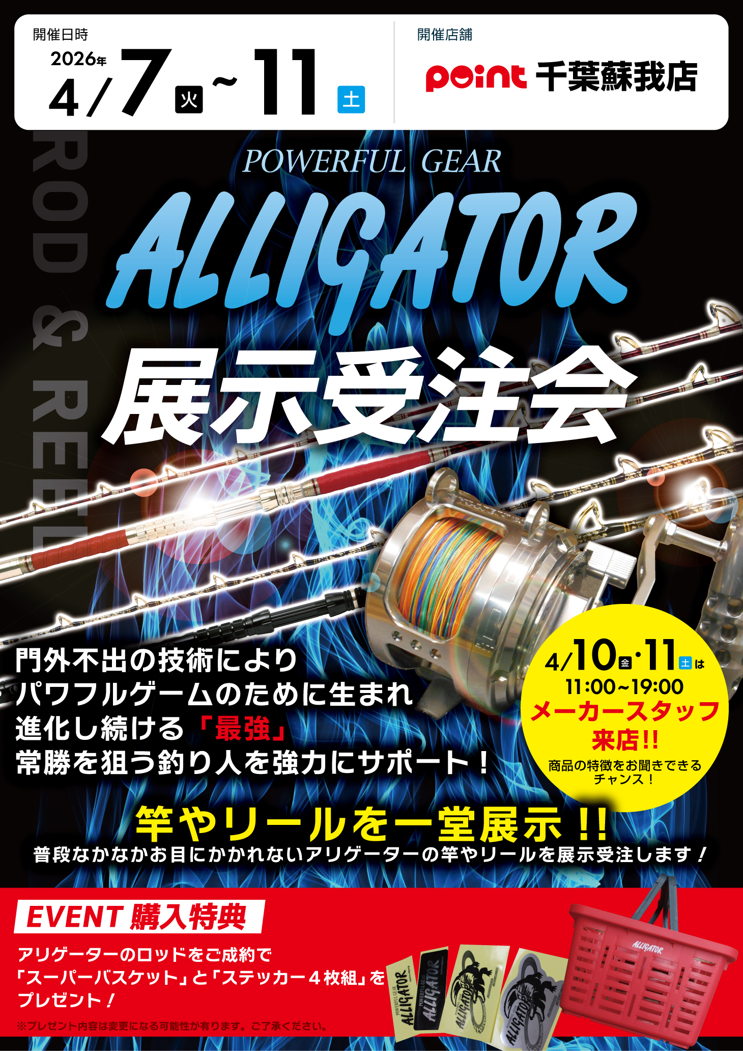 開催 【日時】2026年4月9日(木)13日(月) 【場所】釣具のポイント 高砂明姫店 新商品を全機種展示&予約受注 2026年の新商品を全機種展示即売&予約受注!...