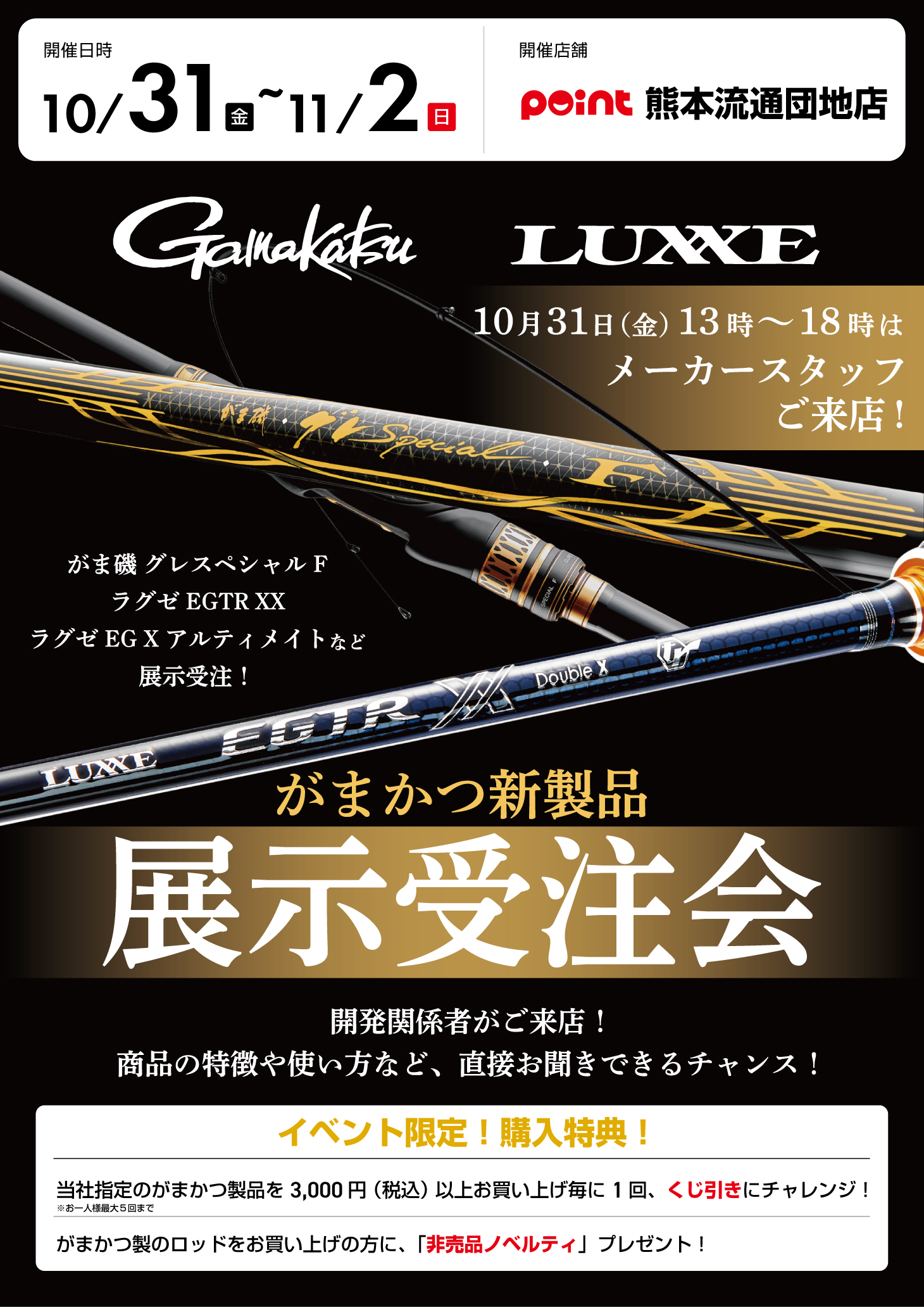 開催 【日時】2025年10月31日(金)11月2日(日) 【場所】釣具のポイント 熊本流通団地店 がまかつ新製品を展示受注! がまかつ・ラグゼの新製品を展示!...