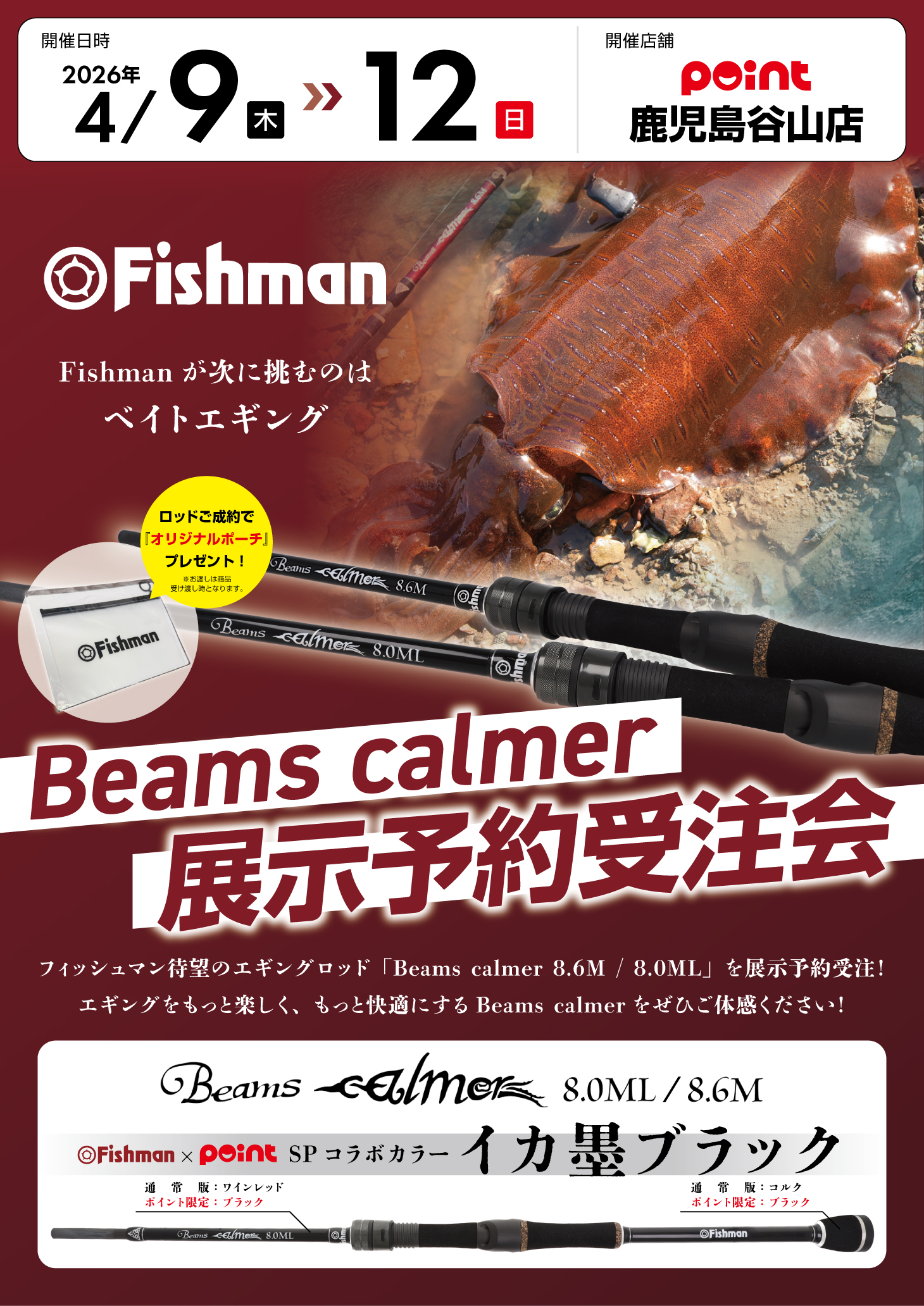 開催 【日時】2026年4月9日(木)12日(日) 【場所】釣具のポイント 大分下郡店 Beams calmer(ビームス カルマー) 展示予約受注!...