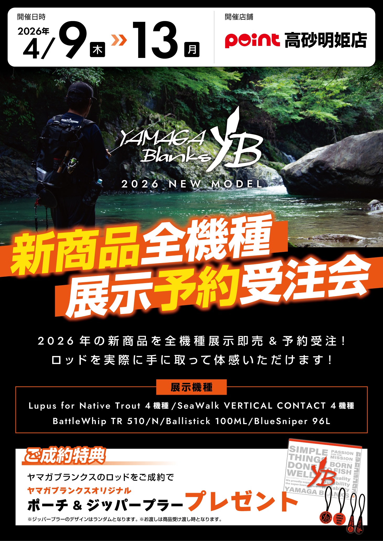 開催 【日時】2026年4月9日(木)13日(月) 【場所】釣具のポイント 高砂明姫店 新商品を全機種展示&予約受注 2026年の新商品を全機種展示即売&予約受注!...