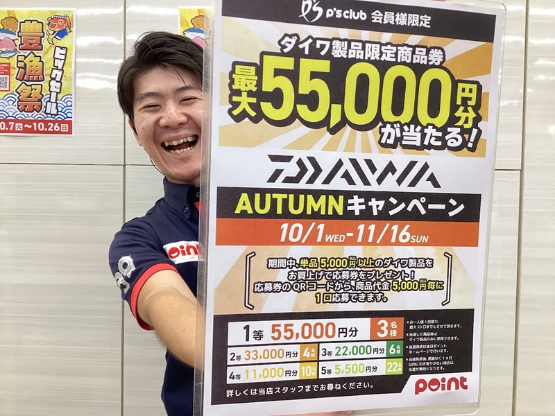 こんにちは!! 東広島店です ! ただいまpointでは P’sクラブ会員様限定企画 ダイワ商品限定商品券が当たる ダイワ AUTUMN キャンペーン 開催中 単品、...
