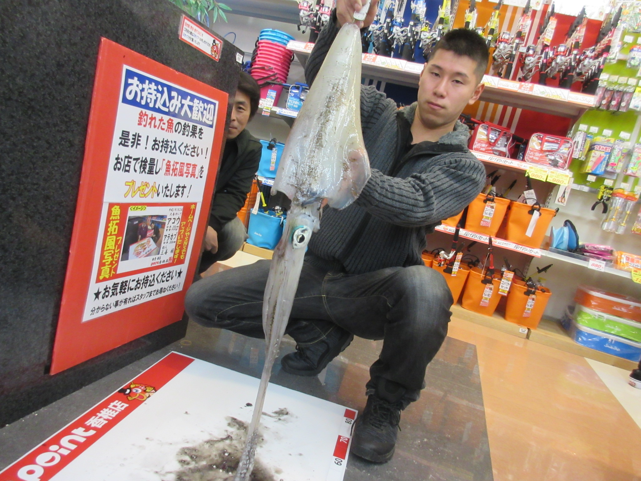 お持ち込みありがとうございます! 有言実行でビッグなアオリイカを 持ってきて頂きました! エギ王K オレンジケイムラの3.5号でHITです! なんと1.5kgもありました!...