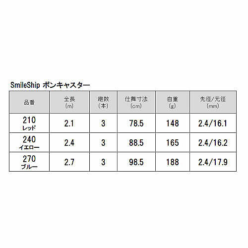 BON CASTER(ボンキャスター)の「BON」とはフランス語で良い・Goodの意味。サイズ別のカラフルでかわいいカラーはファミリーフィッシングにもおすすめです。はじめての方にも使いやすいグラス設計の竿は、防波堤からのチョイ投げ釣りやサビキ釣りにも最適です。さぁ、今日もボンキャスター片手に美味しいおかずをゲット!!お手軽フィッシングへ出かけよう-♪[スマイルシップ/SmileShip]