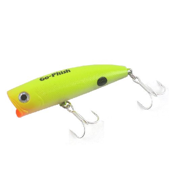 【ゴーフィッシュ/Go-Phish】TACKLEHOUSEの名作ポッパーCFP-70のGo-Phishカスタムモデル[70-P] (ウエイト改)。水面直下を艶めかしくアクションさせる為にヘッドウエイトを追加、CFP譲りのチャガー音はもちろん、小さく甘いポップ音、ソフトアクションによるミノーライクな泳ぎまで、水面-水面直下に来る様々なターゲットに口を使わせます!
