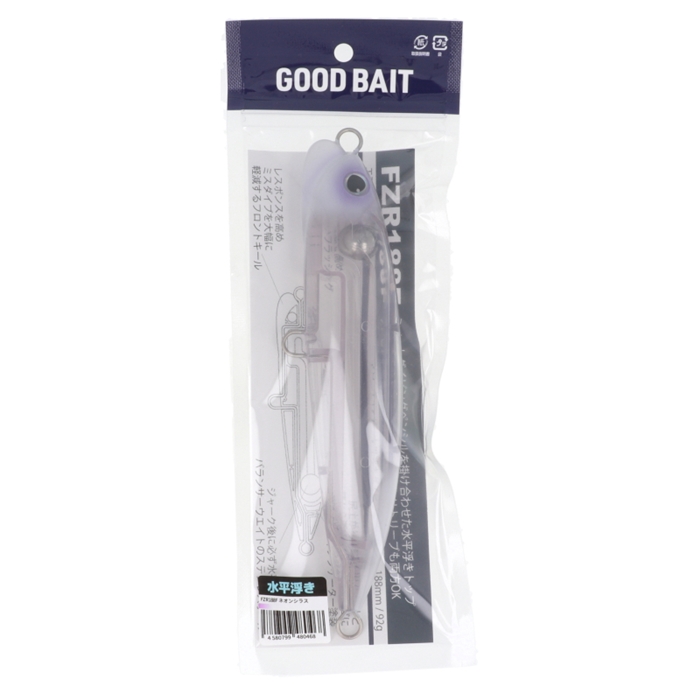 【グッドベイト/GOOD BAIT】世の中には様々なダイビングペンシルが存在する。しかしどれも似た様な形状、似た様なアクション。だから釣果に革新的に大きな差は生まれない。もう何かに似たルアーを作りたいとは思わなかった。釣れない時に全く違うアプローチで状況を打破する。そんなルアーを作りたい。じわじわ浮く水平浮き。ダイビングアクション。リトリーブでスイミング。経験した事のあるダイビングペンシルと違うので戸惑われるかもしれない。きっと日々ルアーを見続けている魚もそう感じるに違いない。[エフゼットアール 188F]