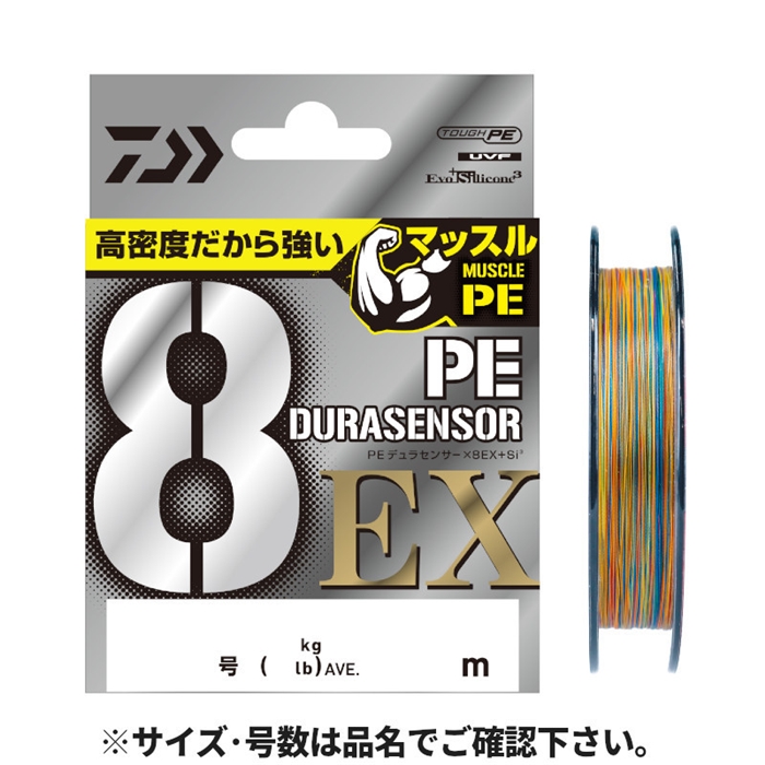 糸表面が非常に滑らかに!ハイスペック8ブレイドライン!ダイワ独自の「EX加工」を採用し糸表面が非常に滑らかになり、飛距離UP、音鳴り・ゴミ付着が減少した。+Si2をパワーアップした+Si3加工を採用することで、更に擦れに強く、耐久性もアップしている。また、密に編み込まれていることで(ダイワ社比)、糸としての質が格段に向上している。[UVF PE DURASENSOR X8EX+SI3]