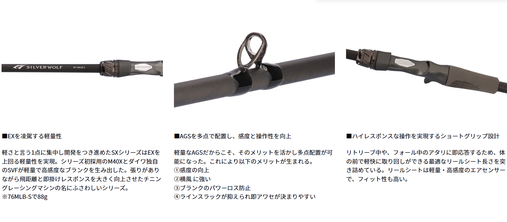 圧倒的な軽さという牙を磨き上げた「SX」シリーズは穂先部分に高弾性、高感度のメガトップRを採用。
