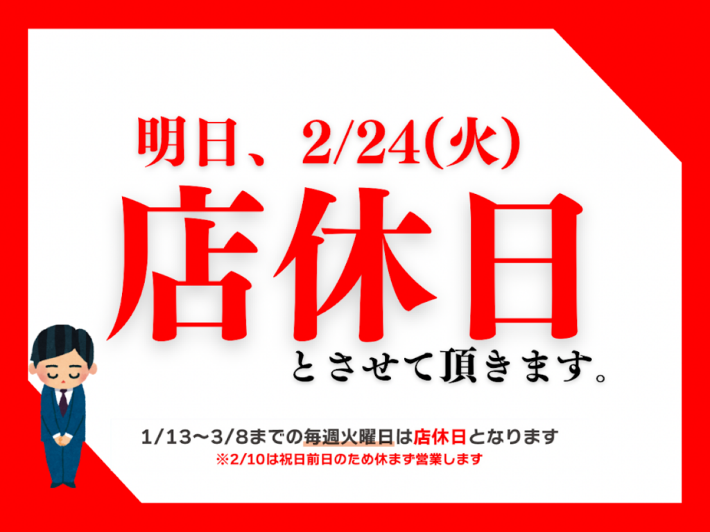明日は【店休日】となりますので、 お買い物・ご用件はぜひ本日中に✨