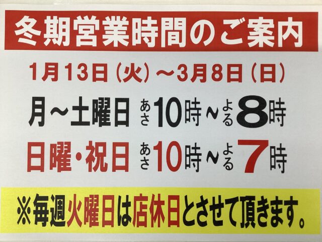 みなさま、こんにちは(^O^)/ 当店では1月13日(火)から 冬期営業時間になります 冬期営業時間 1/13(火)3/8(日)まで 月...