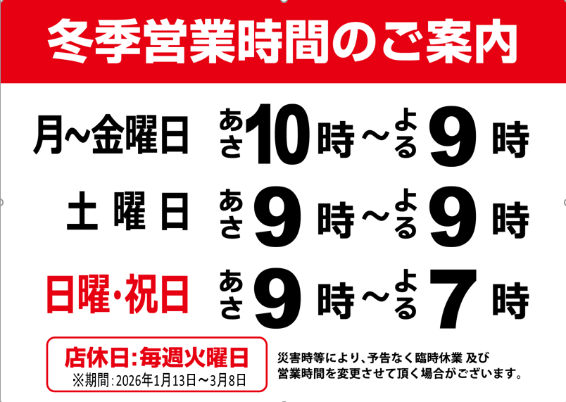 ❄️冬期営業時間・店休日のご案内❄️(倉敷水島店)