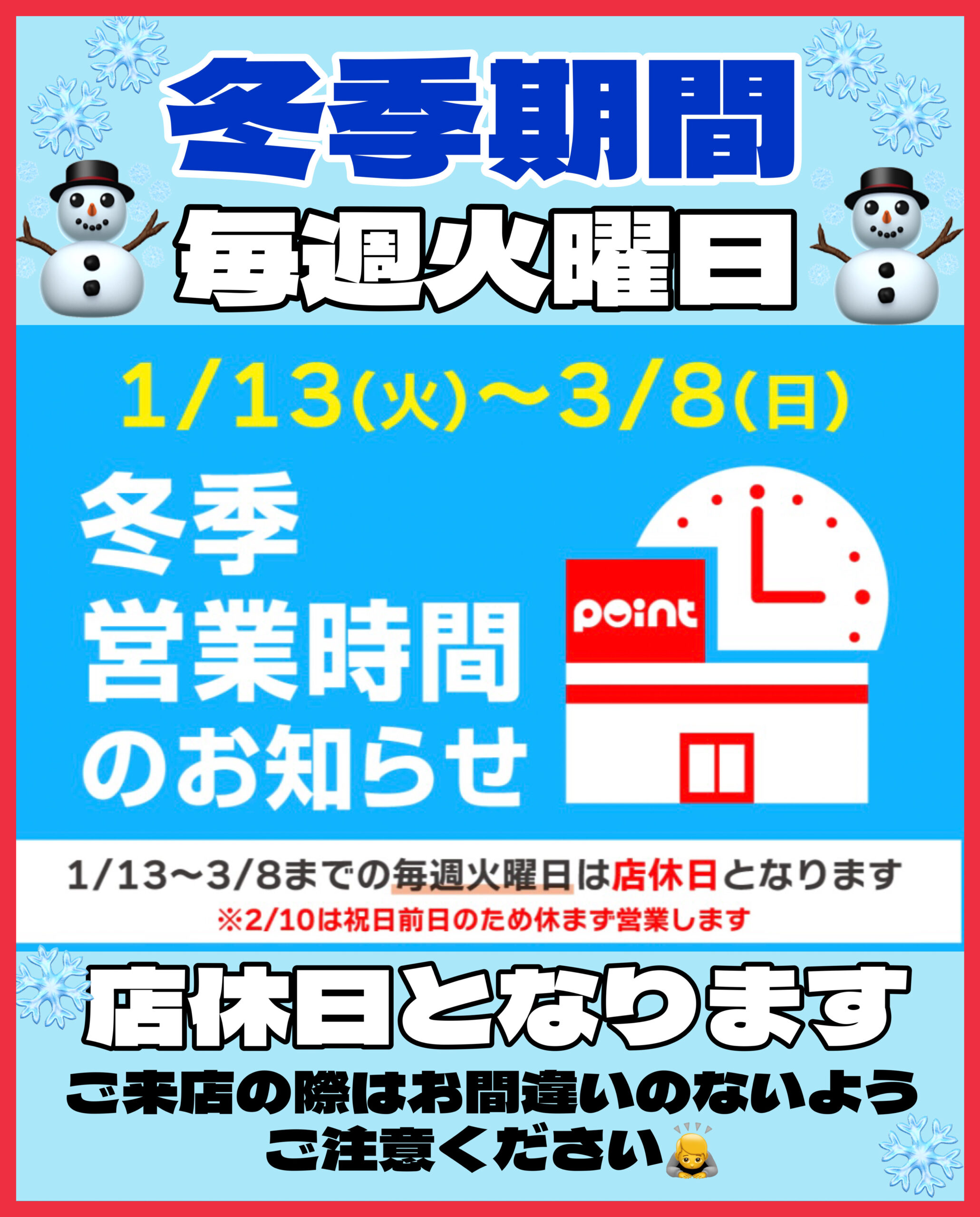 皆さんこんにちは! ポイント倉敷水島店です! 冬季営業時間のご案内です 1月13日(火)から3月8日(日)まで 冬季営業時間となります。 ...