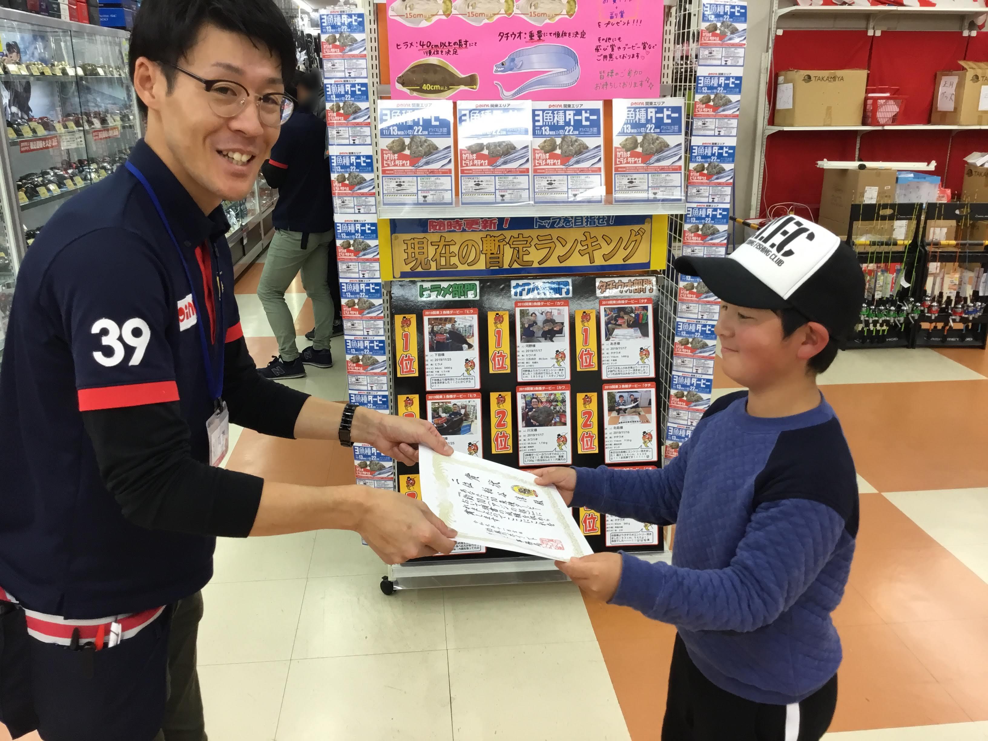 ポイント魚種ダービーアジの部 におきまして 見事位入賞されました粕谷様の表彰式を開催させて頂きました!!! 粕谷さまには賞状と景品をお渡しさせて頂きました!!!...