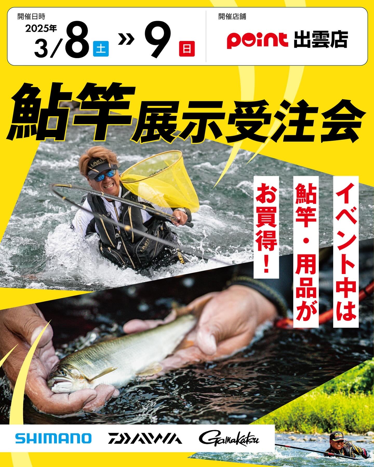 皆様こんにちは ポイント出雲店です!! 開催日時 【日時】2025年3月8日(土)9日(日) 【場所】出雲店 協賛メーカー シマノ・ダイワ・がまかつ ...