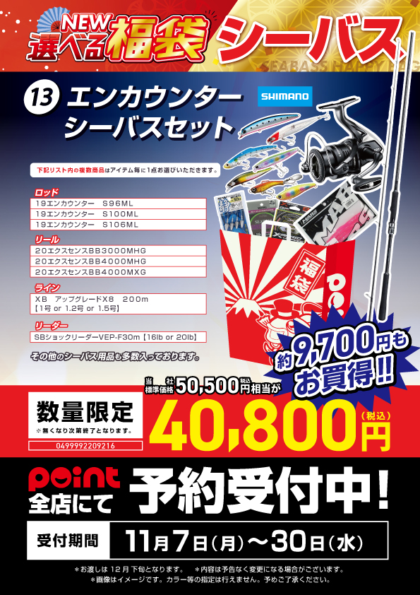 みなさん、こんにちは!! 福袋紹介第13弾!! シーバスを始めてみたい方必見です!!! エンカウンターシーバスセット です!! 当店シーバス担当シンちゃんイチオシですよ!! 漆黒でカッコいいです...